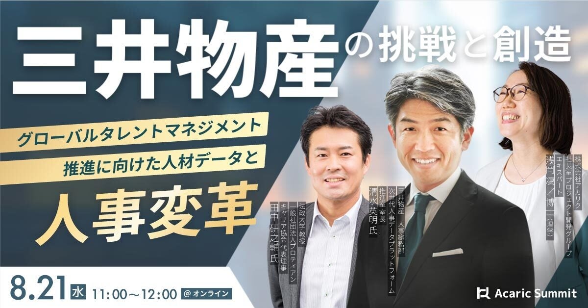 技術者・研究者に特化した採用・キャリア支援サービスを提供する株式会社アカリク(本社:東京都渋谷区、代表取締役:山田 諒、以下「弊社」)は、三井物産株式会社 人事総務部 次世代人事データプラットフォーム推進室 室長の清水氏と、弊社顧問である法政大学教授の田中氏をゲストにお迎えし、「三井物産の挑戦と創造 グローバルタレントマネジメント推進に向けた 人材データと人事変革」というテーマのウェビナーを開催いたします。