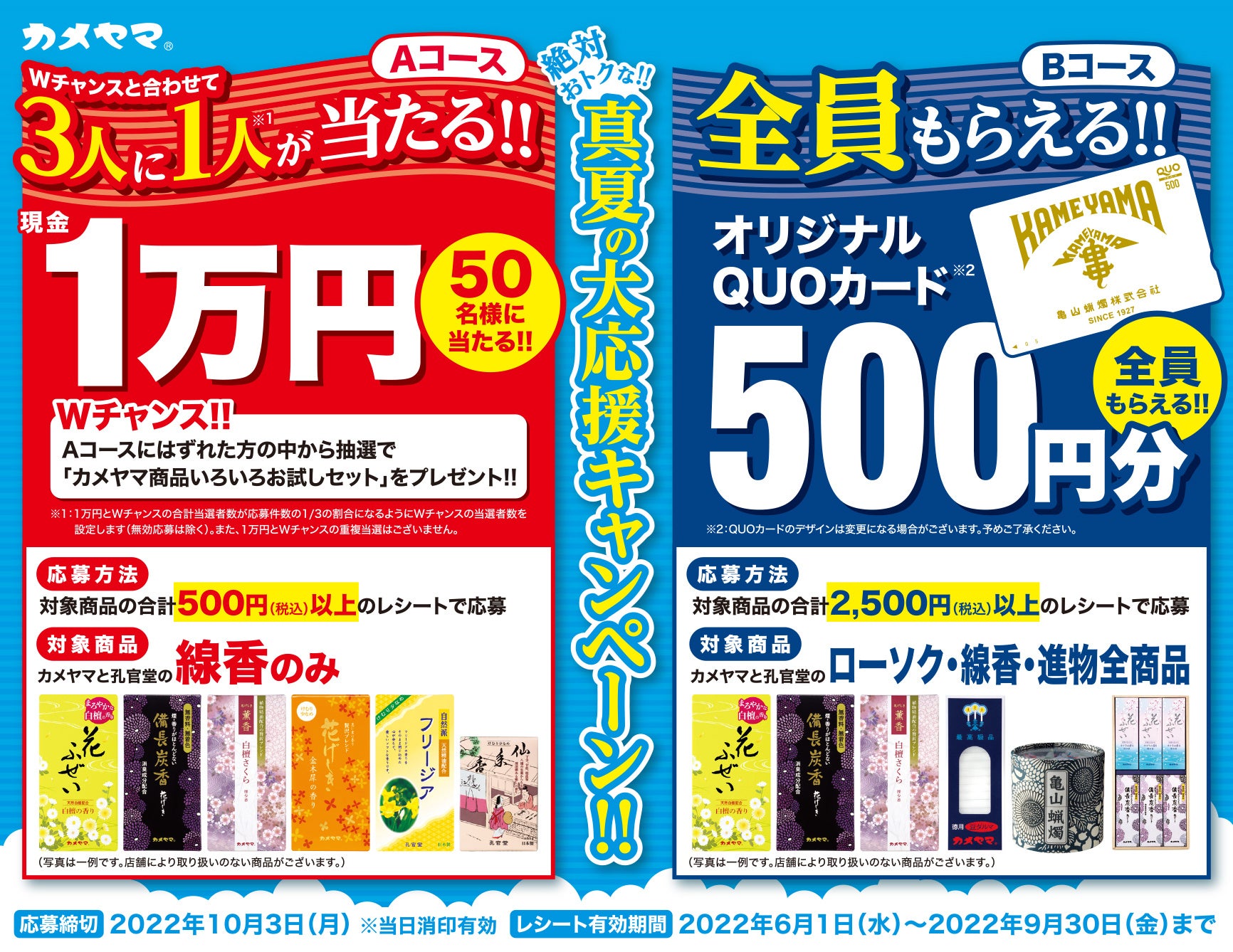 カメヤマと孔官堂のローソク・線香・進物全商品、合計2,500円(税込)以上のレシートで応募。