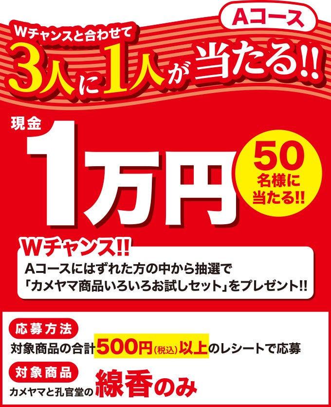 カメヤマと孔官堂の「お線香」、合計500円(税込)以上のレシートで応募。抽選で50名様に現金1万円が当たる!
