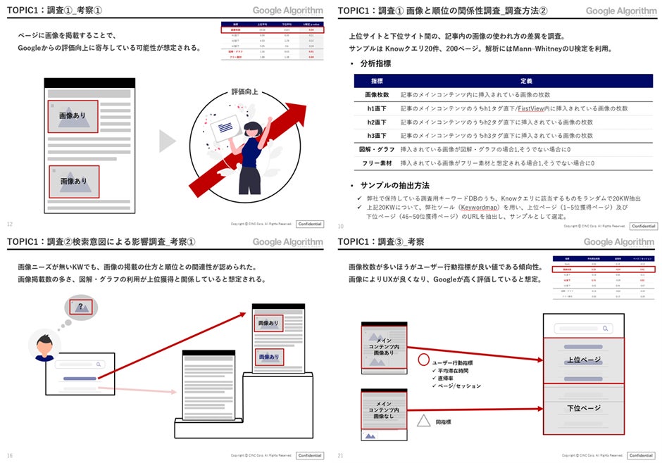 今回のGoogleアルゴリズムリサーチレポートでは、記事中の画像と検索順位の関係性、記事文章の読みやすさと順位の関係性などについて、調査・分析した結果を掲載しています。