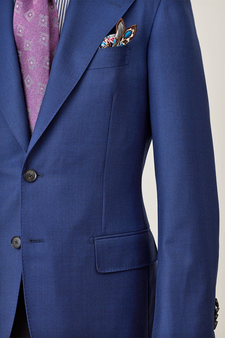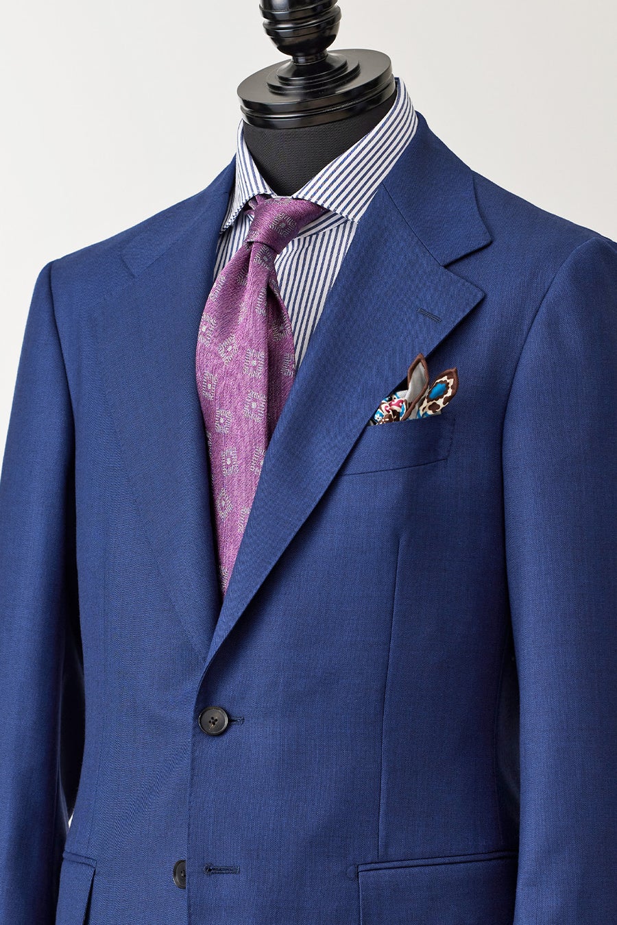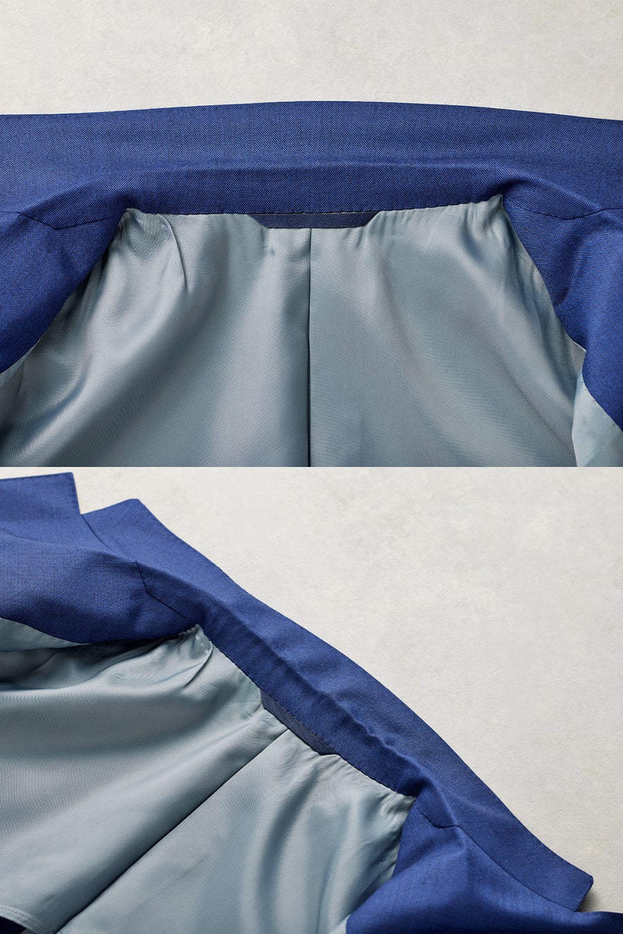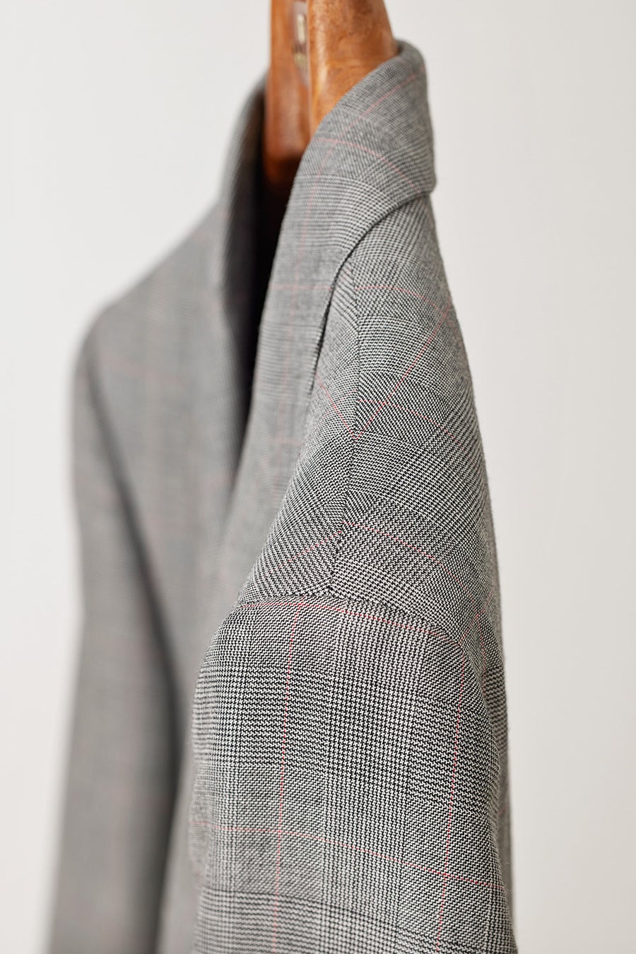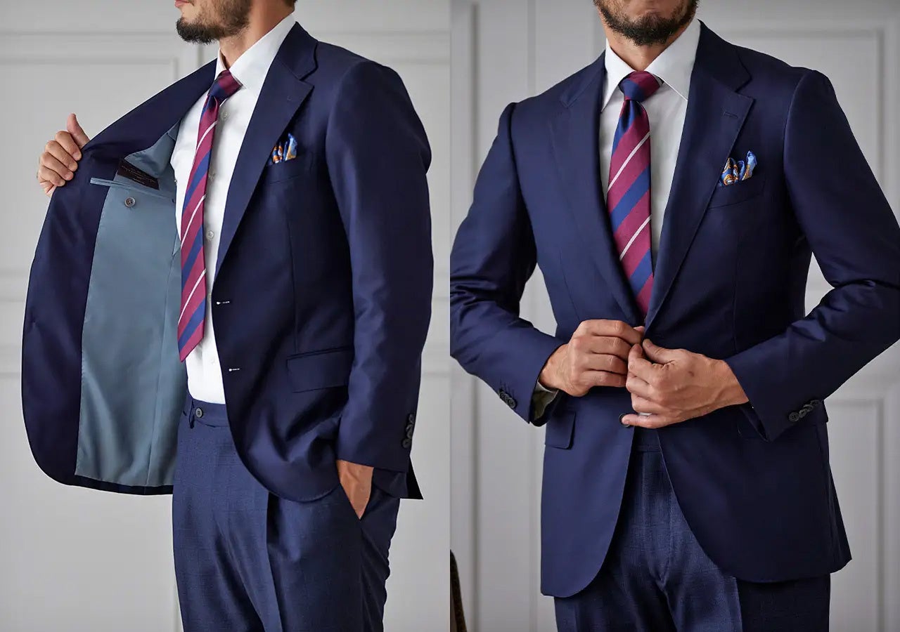 肩先から上襟にかけてのぼりのラインも美しく、どんな体型の人が着ても首回りに吸い付いて、着ていて楽なスーツになります。