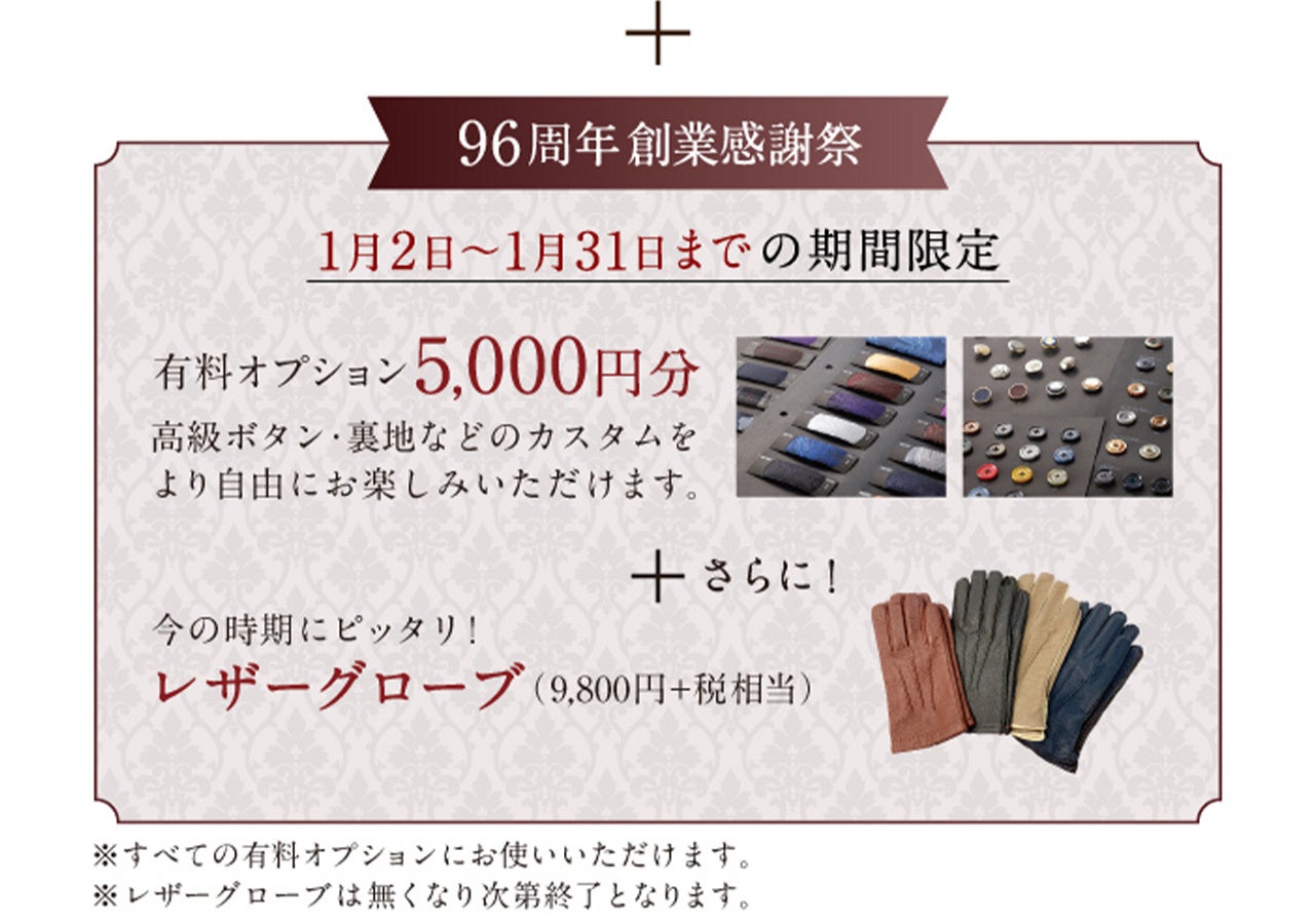 【豪華特典付き】グローバルスタイルが96周年感謝祭でプレミアムオーダースーツフェアを1/31まで開催。「高級オプション5,000円分+レザーグローブ」をプレゼント!