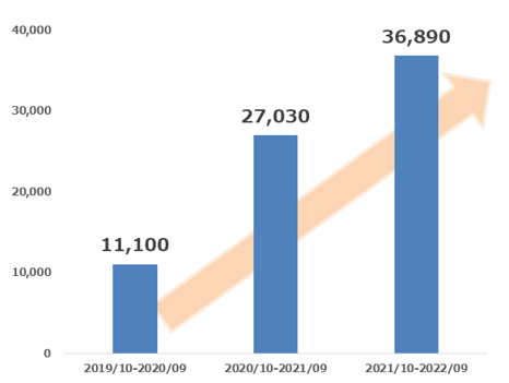 トリュフ塩とは「天然塩」、または「自然塩」と呼ばれるこだわりの塩と、乾燥させた黒、または白トリュフを加えた塩の総称です。イタリアやフランスでは卵料理や、パスタ料理に一振りかけることで、トリュフの贅沢な香りを楽しむために用いられ一般的な食材となっています。近年では日本でも徐々に普及されており、人気の高まりを見せています。「トリュフ塩」の口コミは2019年10月~2020年9月迄と2021年10月~2022年9月迄を比較すると約3倍の36,890件まで増加しており、近年注目の食材です。