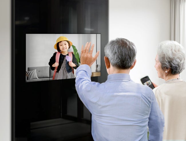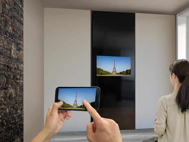 ミラオスの表面には艶消しブラックの鏡面パネルを採用。OFF時にはモニターの存在を感じさせず、空間に調和します。