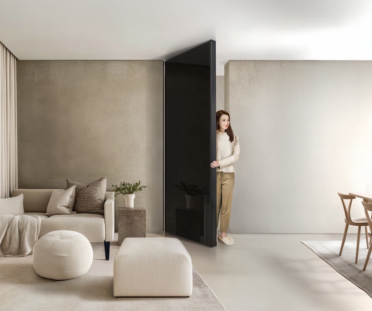 従来の室内ドアは、空間を仕切る役割にとどまり、毎日使うにもかかわらず目を向けられるのは開閉の瞬間だけという存在でした。当社は2005年に天井までの高さがあるフルハイトドア®を発表し、その後約20年にわたって独自の室内ドアを開発してきました。そしてこのたび、ドアの領域を超えた次世代プロダクト「ミラオス」が誕生。電源OFFの時には鏡面仕上げの室内ドアとして空間に調和し、ONにすれば黒いドアに映像が浮かび上がり、暮らしのプラットフォームとして新たな時間を生み出します。
