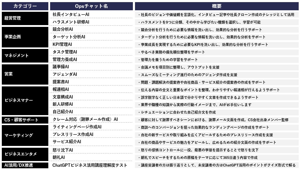 今回リリースした3つ以外にも、既に法人向けChatGPT「Ops(オプス)AI」には当社独自開発のGPTsが搭載されています。