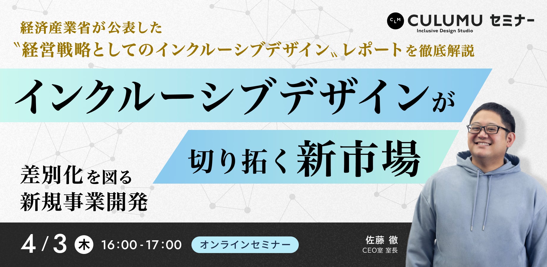 【4/3 セミナー開催】企業の成長戦略に必須!インクルーシブなデザインで市場を広げる手法とは? セミナーでは、経済産業省が公表した〝経営戦略としてのインクルーシブデザイン〟レポートの解説も行います。