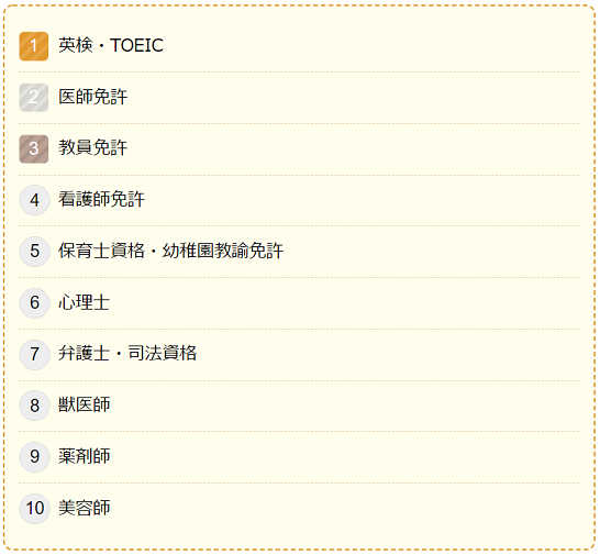 2位以下には、その職業に就くために必要となる免許の資格が並びました。