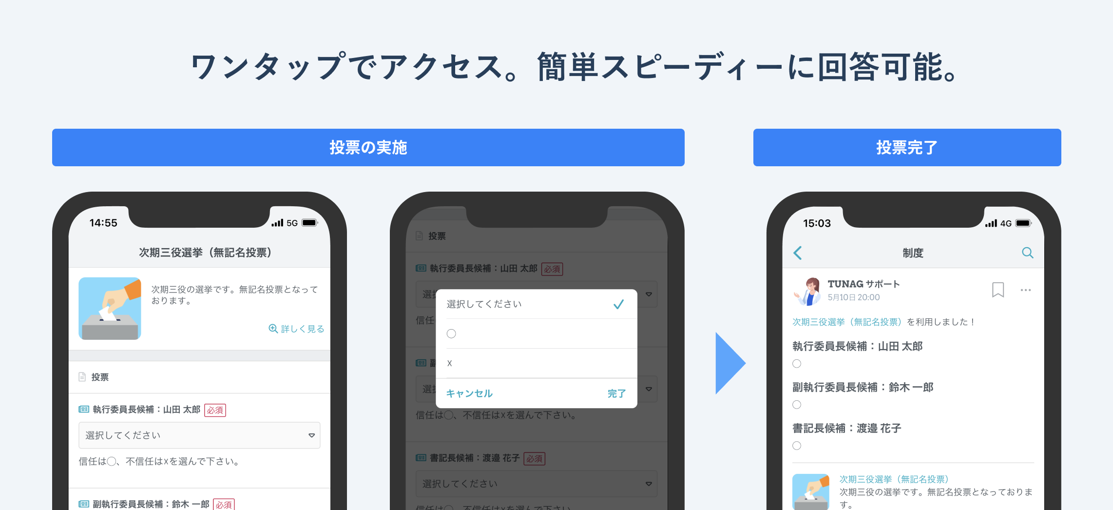 スマートフォン・PCからワンタップで投票画面までアクセスでき、簡単に投票可能です。投票結果は「TUNAGサポート」アカウントからの回答として表示され、TUNAG管理者であっても回答をした個人の特定ができません。