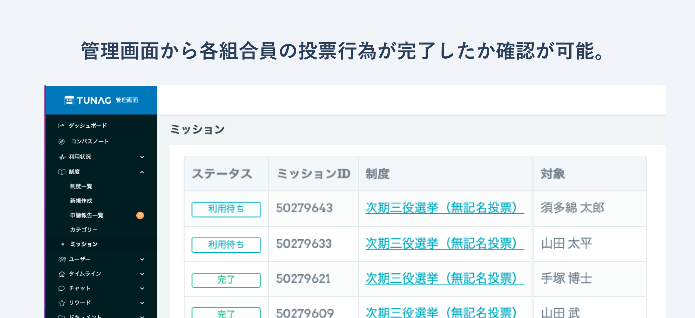 TUNAG管理者権限を持つ方は、管理画面から各組合員の投票内容は見えない状態で、投票行為自体を完了したか確認することができます。これにより未回答のユーザーのフォローも簡単に。また、重投票を防ぐ設定も可能です。