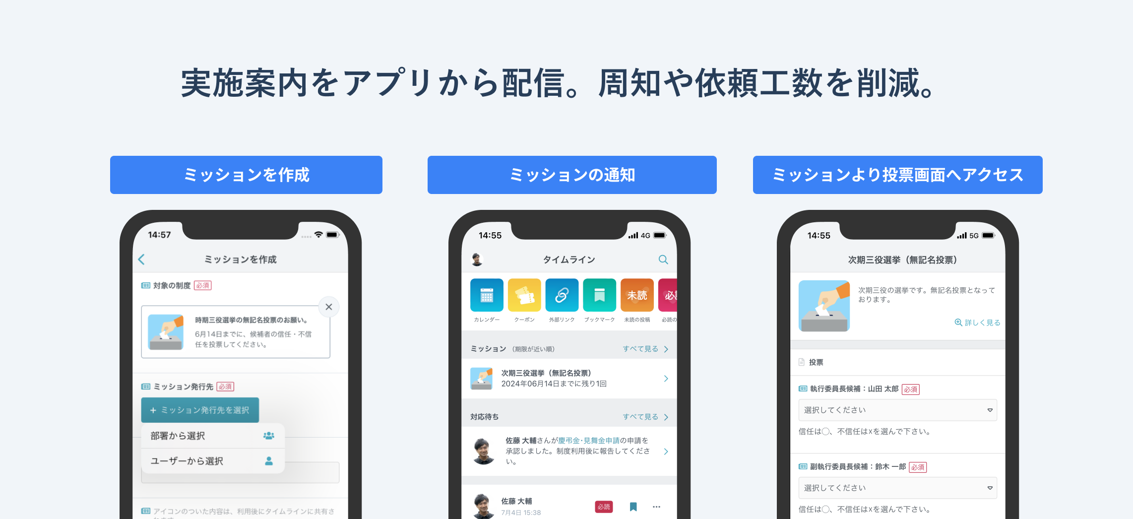 役員選挙や組合員アンケートの実施案内をTUNAG上から配信でき、周知や依頼の工数を削減します。
