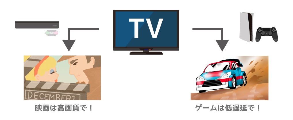 「ALLM (Auto Low Latency Mode)」は、テレビの<低遅延モード>と<高画質モード>がシーンに応じて自動的に選択される技術です。「ゲームの時は低遅延」「映画を観る時は高画質」など、手動切替の手間なく最適なモードを選択可能。また、ゲームプレイ時に遅延の大きい高画質モードにされるのを防ぐため、遅延を気にせず快適にゲームを楽しむことができます。