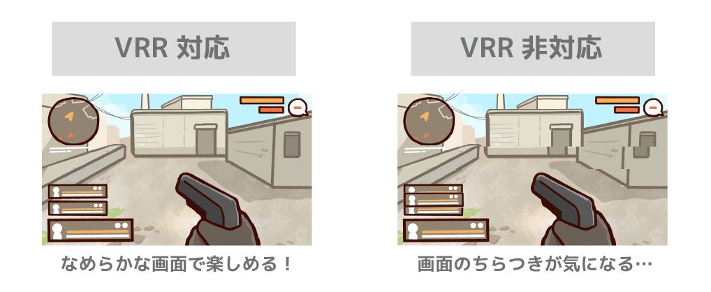 「VRR(可変リフレッシュレート)」は、コマ落ち(スタッタリング)やちらつき(ティアリング)が抑制される技術です。動きの激しいアクションゲームも快適にプレイすることができます。