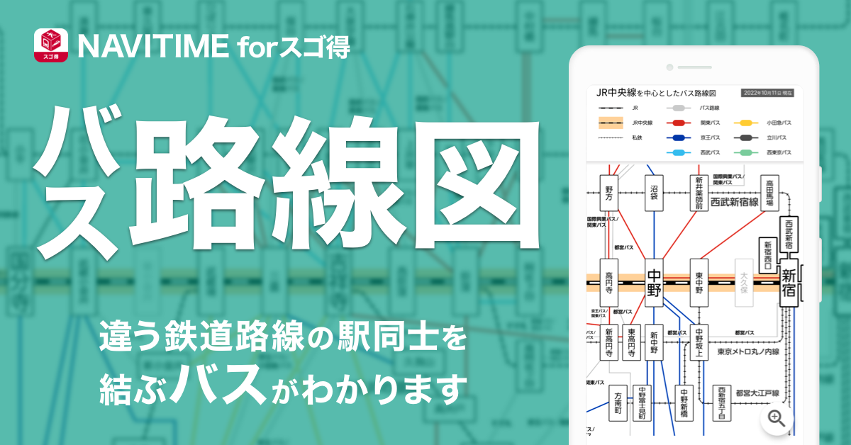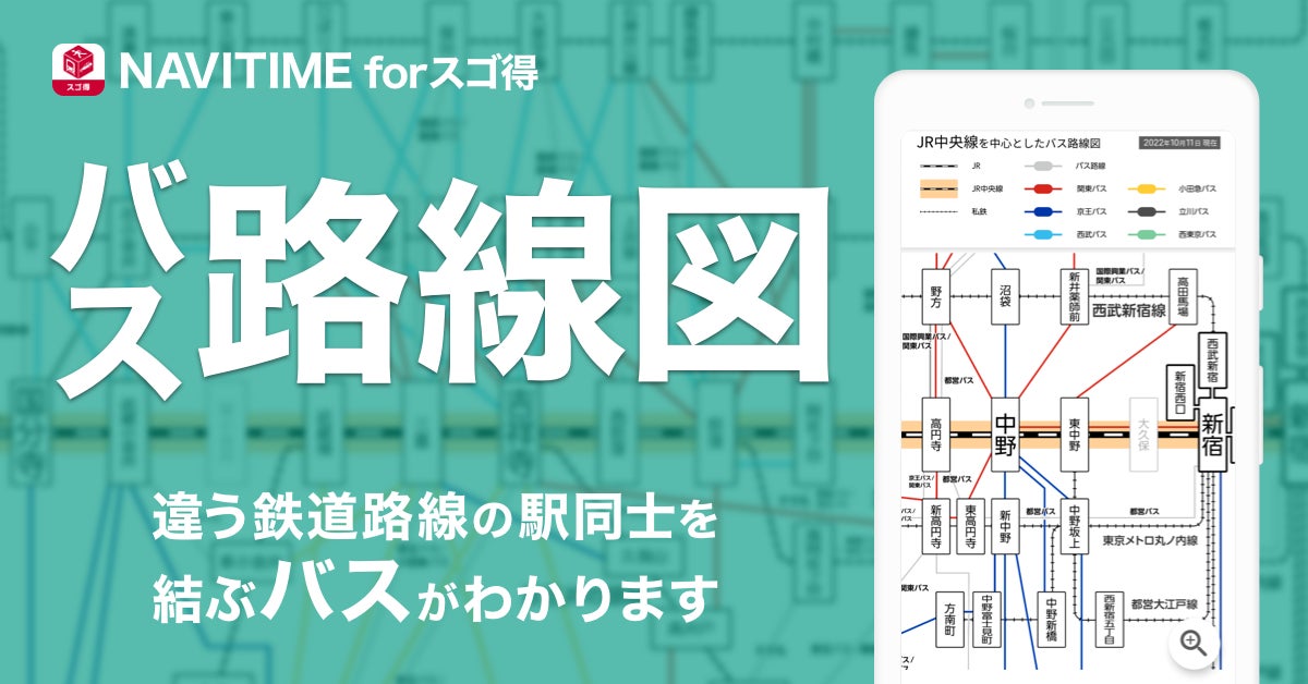 株式会社ナビタイムジャパン(代表取締役社長:大西 啓介、本社:東京都港区)は、2022年10月27日(木)より、株式会社NTTドコモ(代表取締役社長:井伊 基之、本社:東京都千代田区)の提供する「スゴ得コンテンツ」にて提供中のAndroid OS向け『NAVITIME forスゴ得』※1アプリにて、JR中央線を中心に、並行する他路線の駅間を結ぶバスの路線図※2を提供開始いたします。