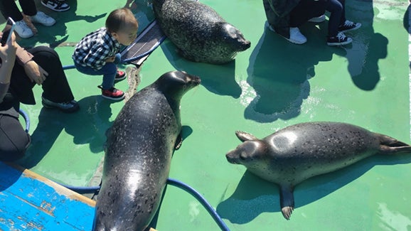 アザラシは好き勝手にウロウロする ⇔ お客様は間近でアザラシを見ることができる