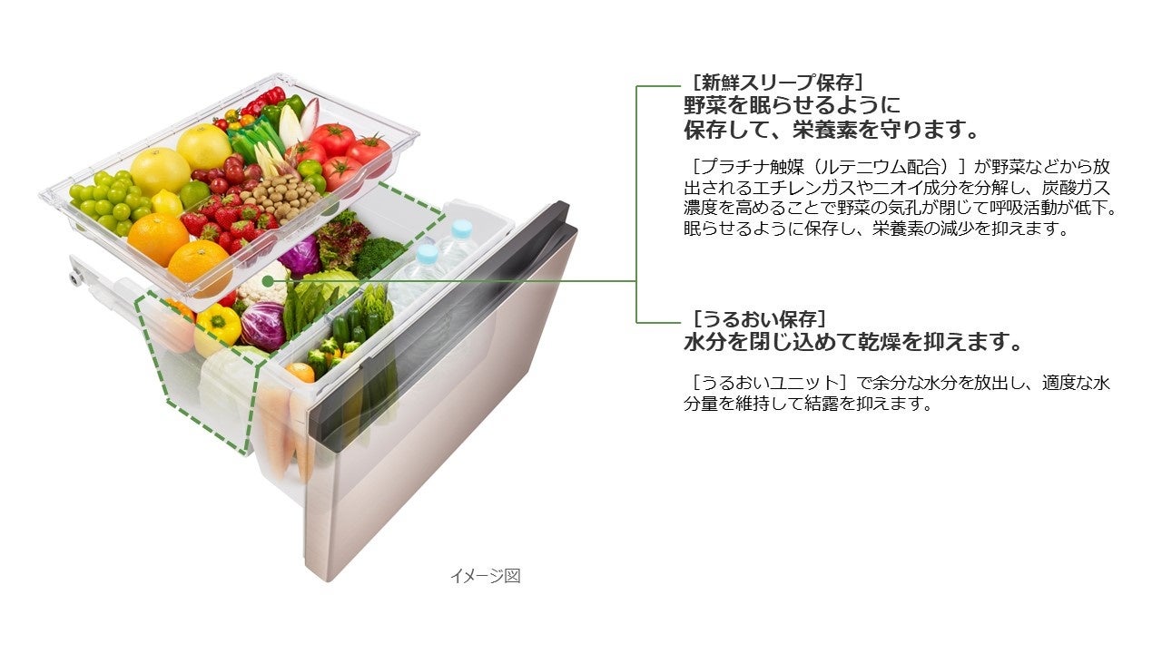 ■眠らせるように保存するから、みずみずしさが長持ち。「新鮮スリープ野菜室」 ※下段スペース