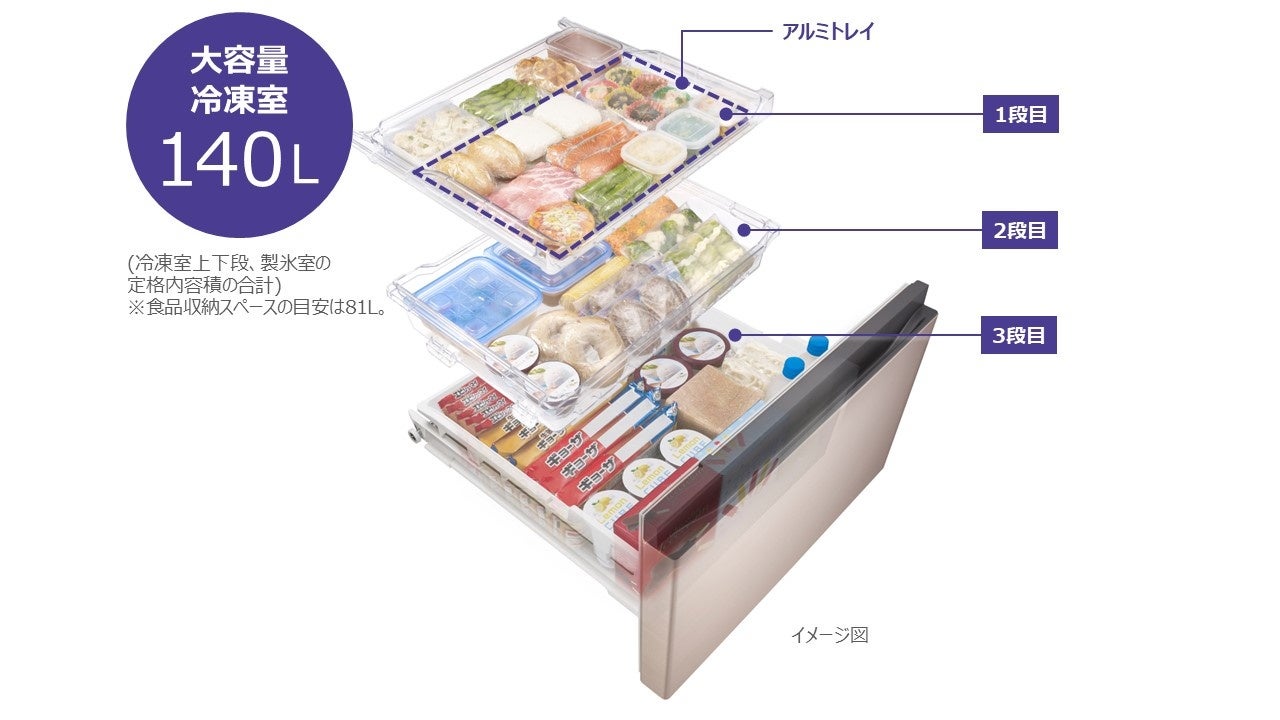 (*1) 冷凍室上下段、製氷室の定格内容積の合計140L。食品収納スペースの目安は81L。