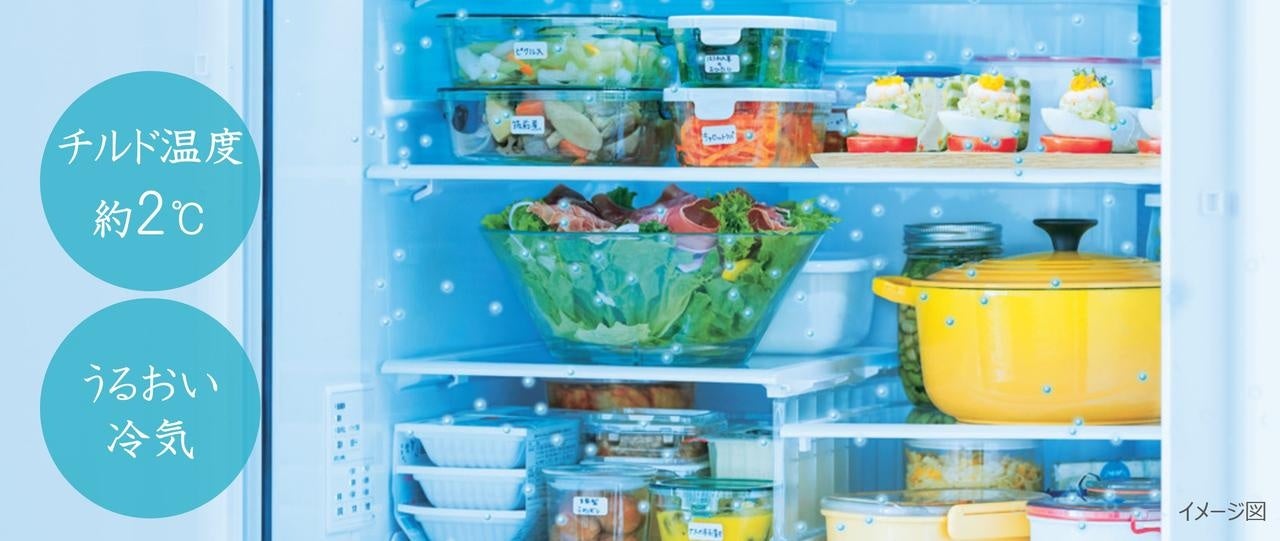 冷蔵室のチルドルームには、「うるおいチルド」を採用し、約+1℃で食品の乾燥を抑えて鮮度を守ります(*6)。