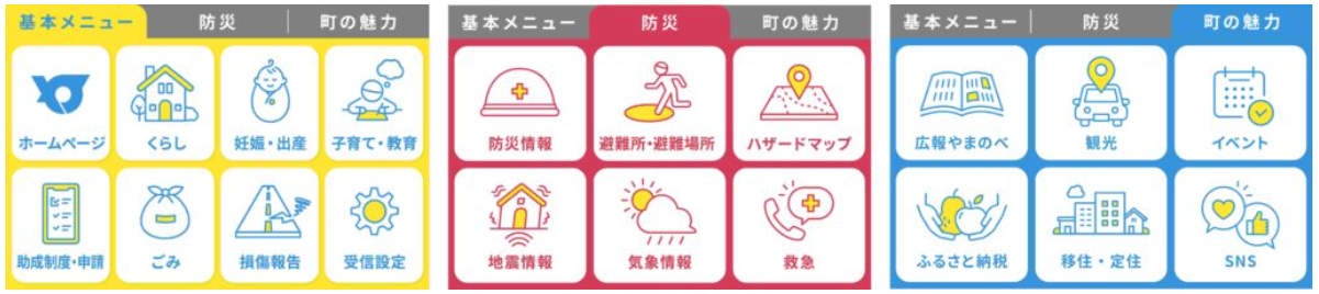 「基本メニュー」「防災」「町の魅力」のメニューから様々な情報を検索することが可能になりました。