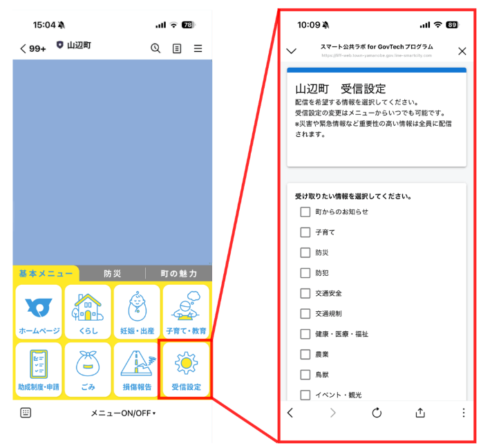 LINEに登録したユーザーは受信設定に回答することで、受け取る情報のカテゴリーをカスタマイズすることができます。町政情報や子育ての情報など必要な情報だけを受信することができるようになりました。