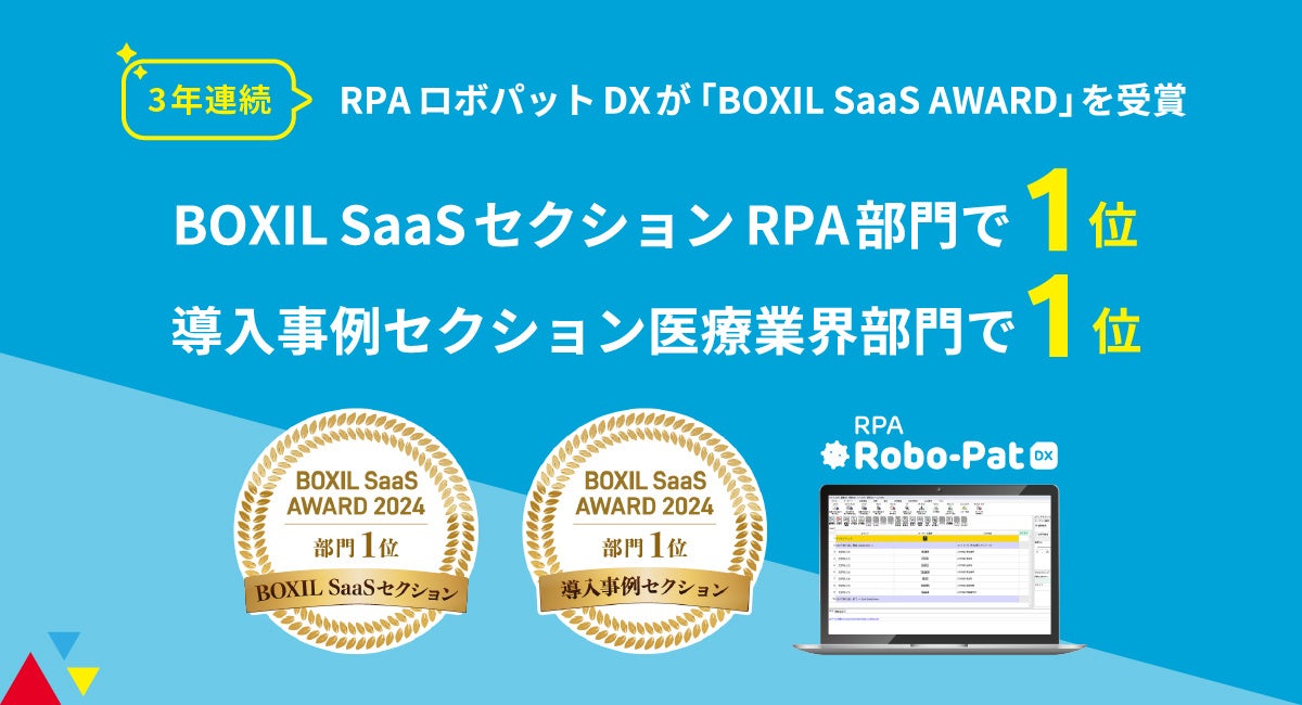 【3年連続】RPAロボパットDXが「BOXIL SaaS AWARD 2024」にてBOXIL SaaSセクションRPA部門で1位、導入事例セクション医療業界部門で1位を受賞
