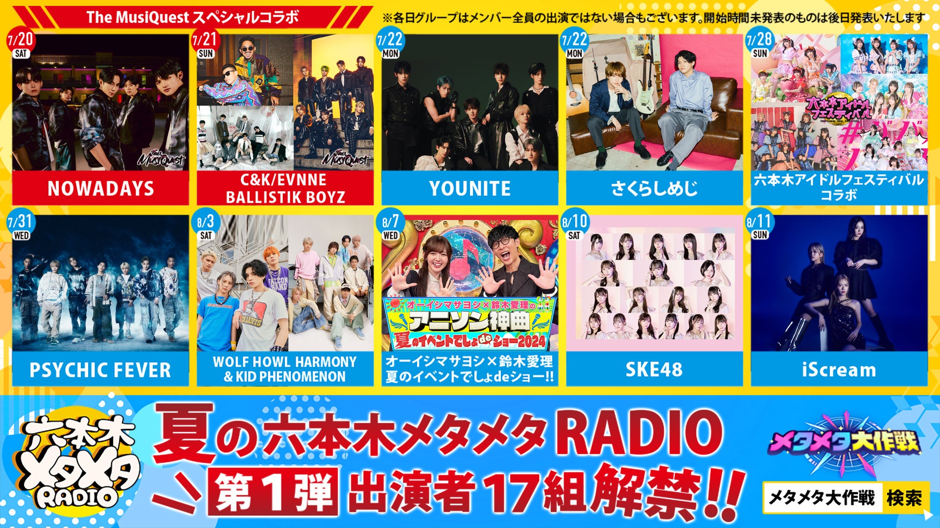 今回、そんな「六本木メタメタRADIO・夏のSPシリーズ」第1弾出演者が決定!!今、世界でトレンドになりつつある7人組・PSYCHIC FEVERや、テレビ朝日公式YouTube「動画、はじめてみました」で総再生回数2億回超えのモンスター番組「アニソン神曲カバーでしょdeショー!!」MCのオーイシマサヨシと鈴木愛理らが登場!!さらにK-POP界からはNOWADAYS、EVNNE、YOUNITEなど新星たちの出演も決定!!