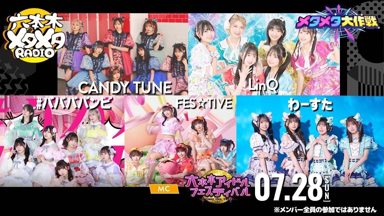 テレビ朝日が主催する、真夏の恒例アイドルイベント「六本木アイドルフェスティバル2024」とのコラボ。イベントに登場する豪華アイドルから、#ババババンビ、FES☆TIVE、LinQ、わーすた、CANDY TUNE(出演予定順)の5組が出演!!詳細時間は後日発表いたします。