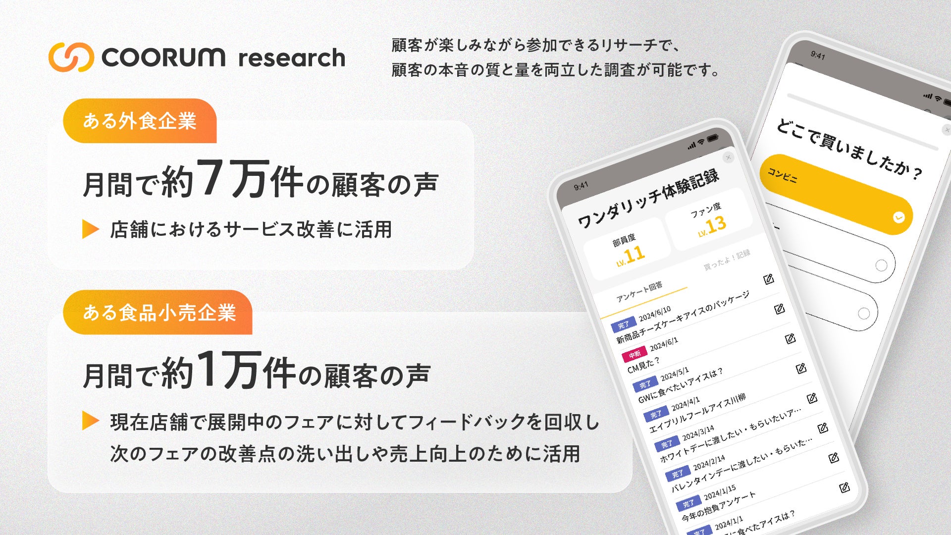 2024年10月に正式ローンチ以来、メーカー・リテール・外食企業を中心に導入いただいております。ある外食企業では、「coorum reserach」を活用し顧客の声を収集したところ、月間で約7万件の顧客の声が集まり、サービス改善に活用されています。また、食品小売の企業では、月間で約1万件の顧客の声を収集し、現在店舗で展開中のフェアに対してフィードバックを回収し、次のフェアの改善点の洗い出しや売上向上のために活用されています。