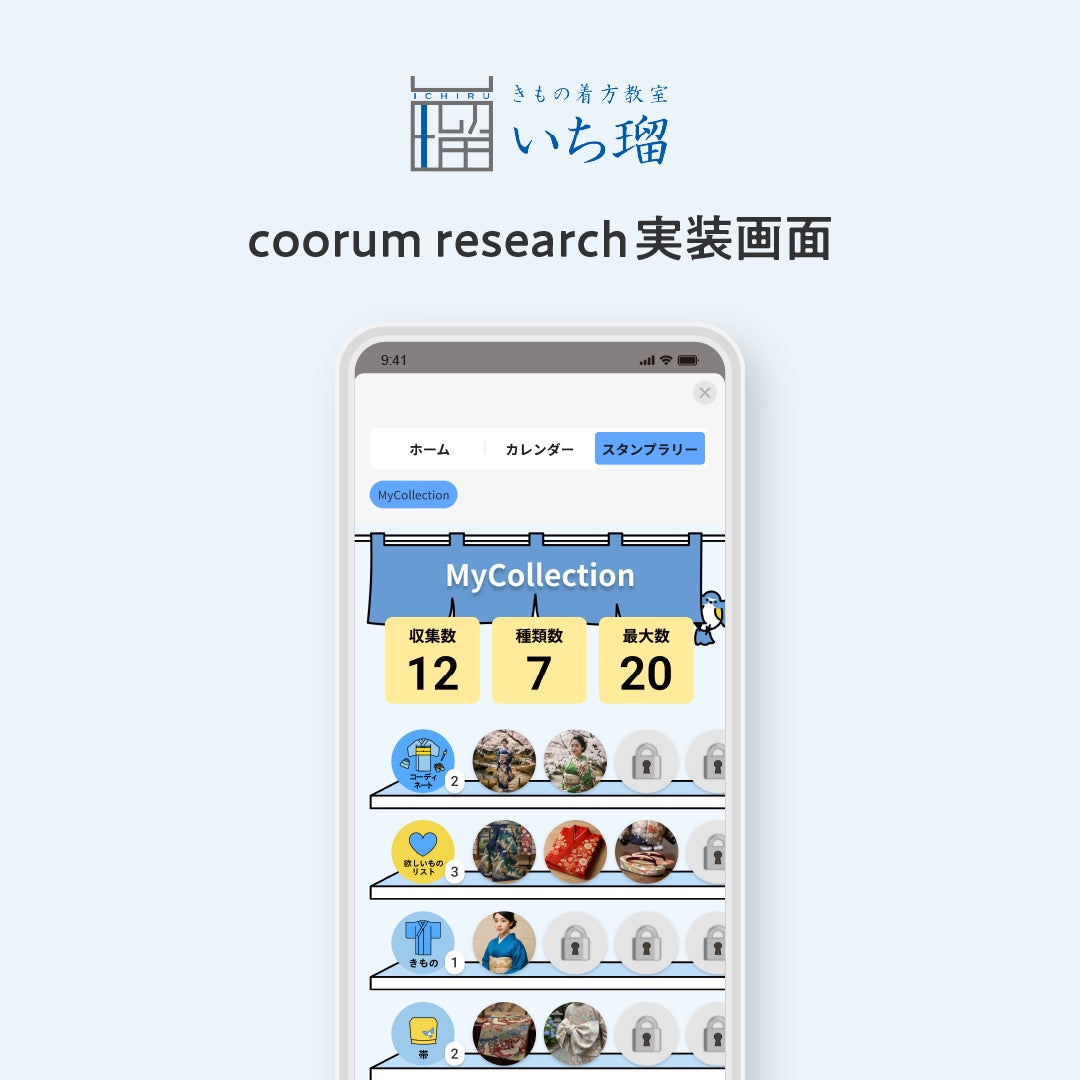 着付けでの授業を中心に、「coorum research」のポップアップ導線を活用することで、授業毎の成長記録→来店後の体験記録→コレクション図鑑・欲しいものリストへ継続誘導の一気通貫設計を実現。顧客がコレクション(きもの・帯・小物など)記録や写真を継続記録することで、顧客自身のニーズやコーディネートの傾向の認知を実現している。