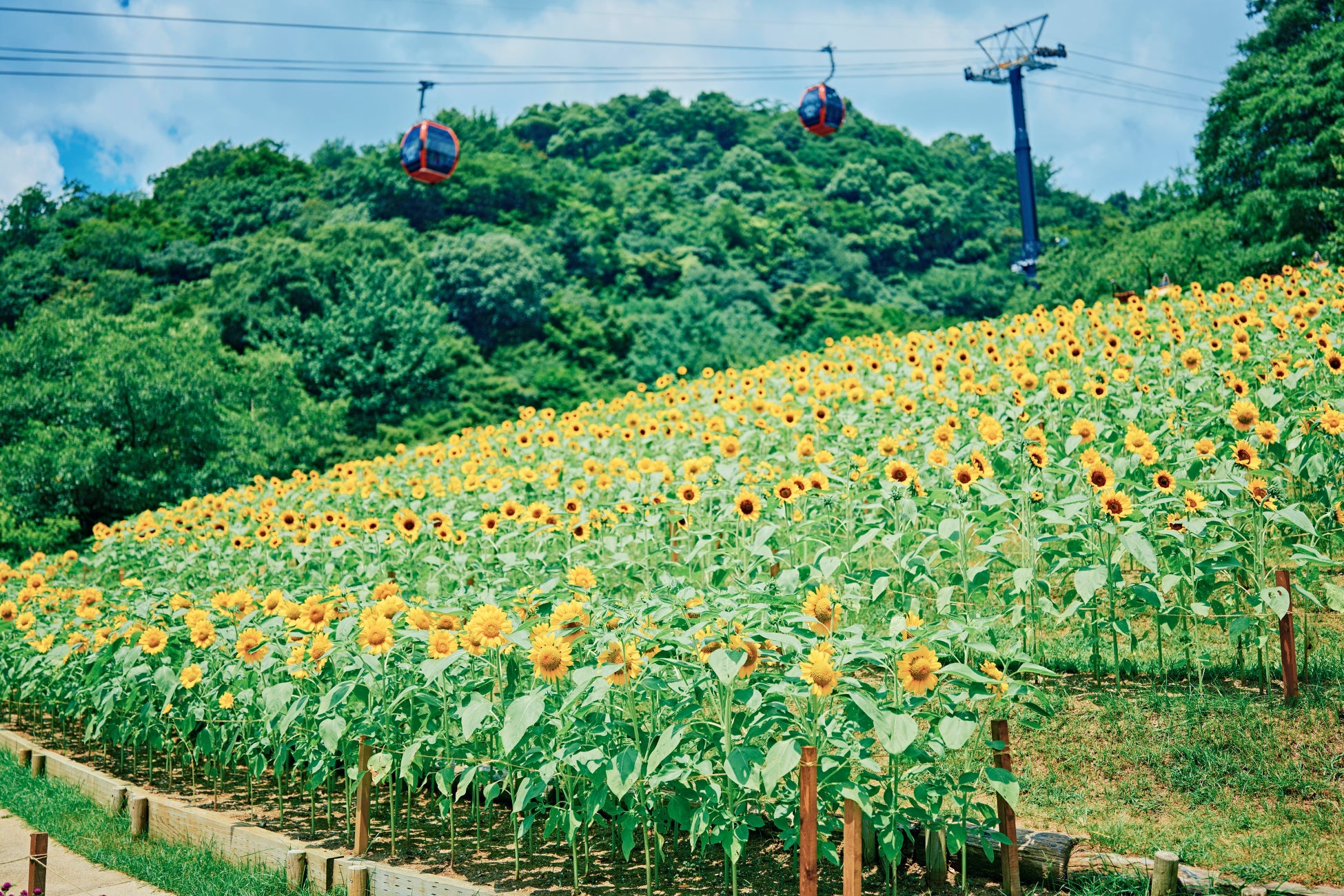 "夏の名物風景"神戸布引ハーブ園の「ひまわり畑」が間もなく見ごろに。昼は元気いっぱいに、夕方は一面黄金色に輝く幻想的風景です。園内各所のひまわりが、様々なロケーションで"きっと忘れない夏"を演出します