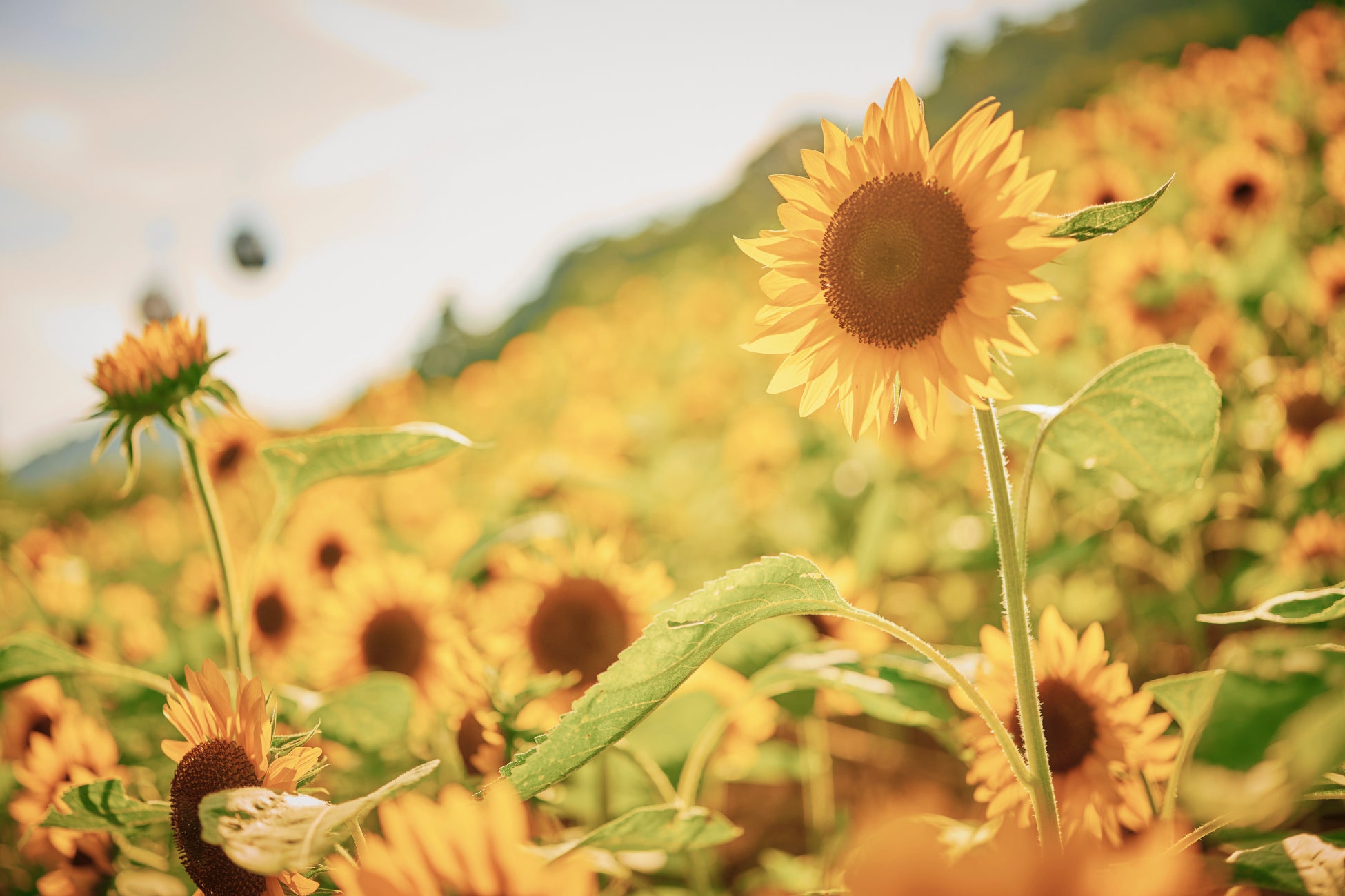 昼は太陽を浴びてキラキラと、夕暮れ時には透き通るような黄金色のひまわり畑に