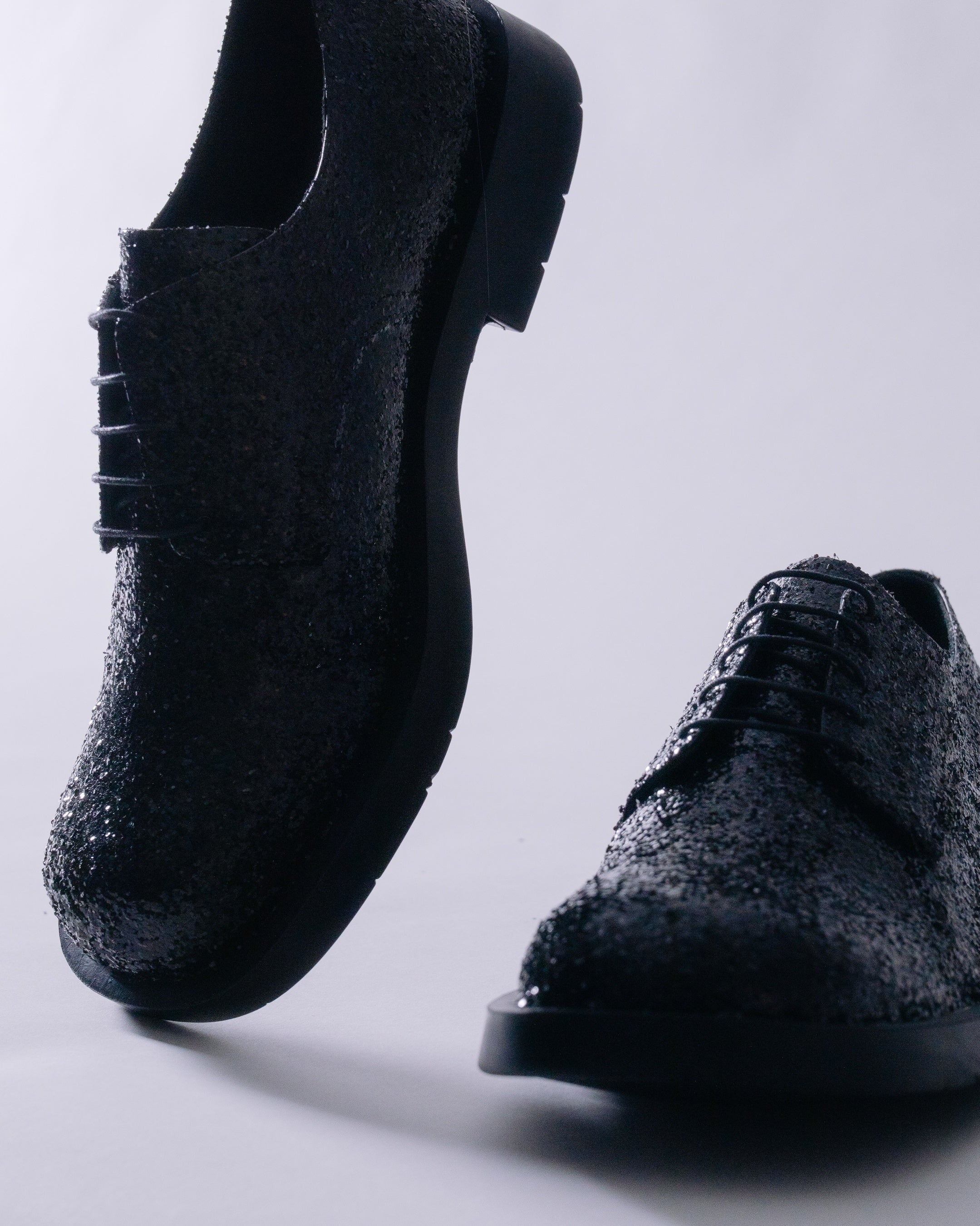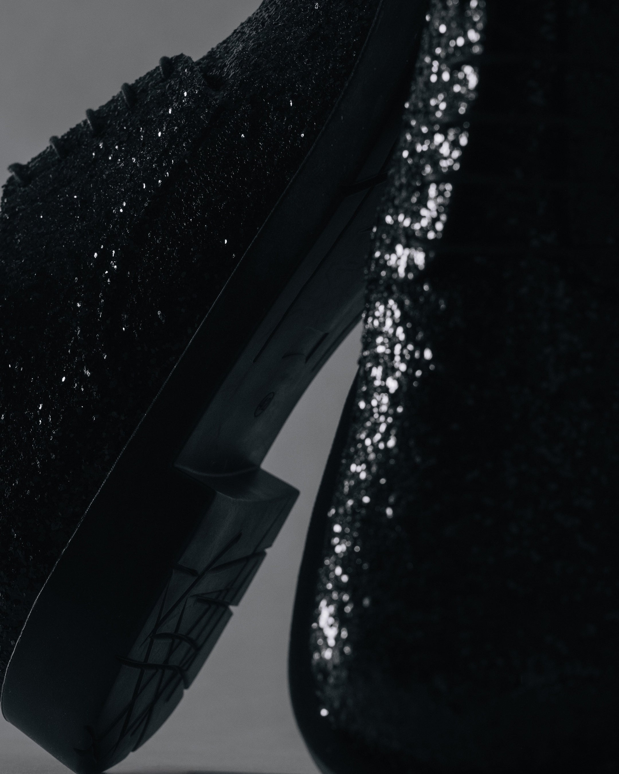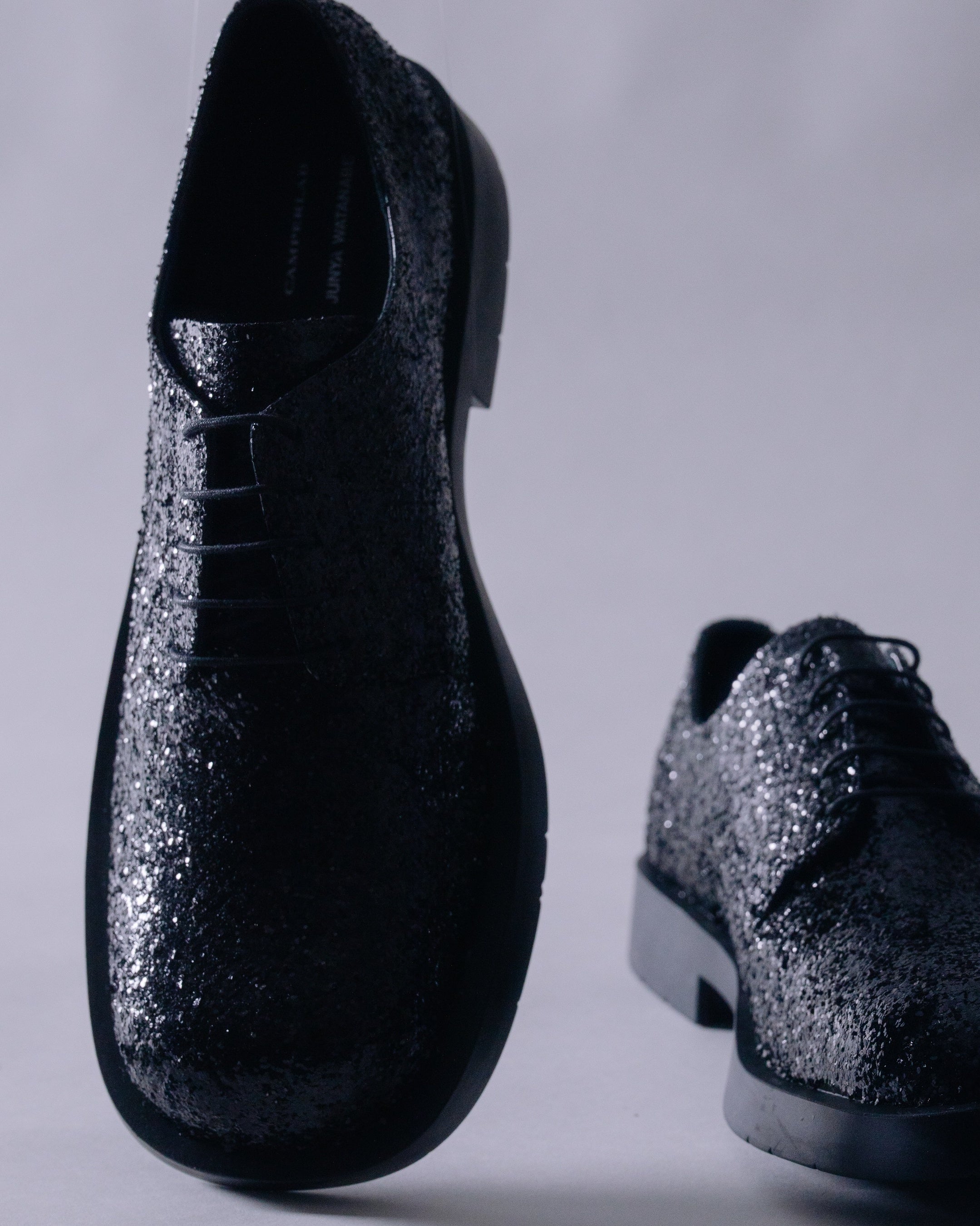 ウィメンズライン「JUNYA WATANABE」は、CAMPERLABを代表するモデルのひとつ「MIL 1978」をベースに。「MIL 1978」は、70年代からインスピレーションを得たクラシックなスタイルで、独特のフォルムとボリューム感が特徴的なモデルです。こちらは職人が1足ずつブラックグリッターを施し、特別な一足に仕上げました。アッパー、ソール、インソールまですべてブラックで統一し、スタイリッシュな佇まいに。極細のシューレースで上品さも演出しました。