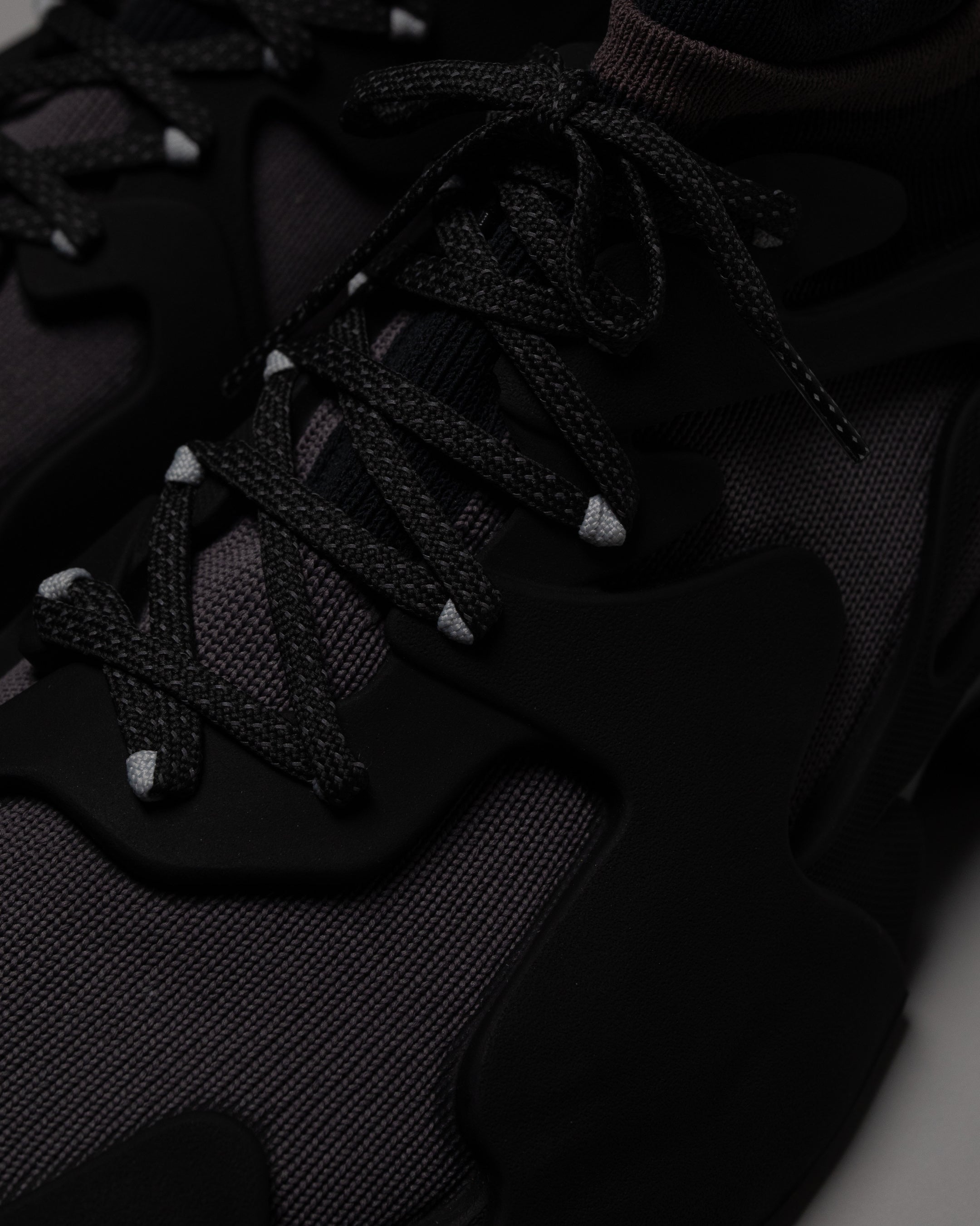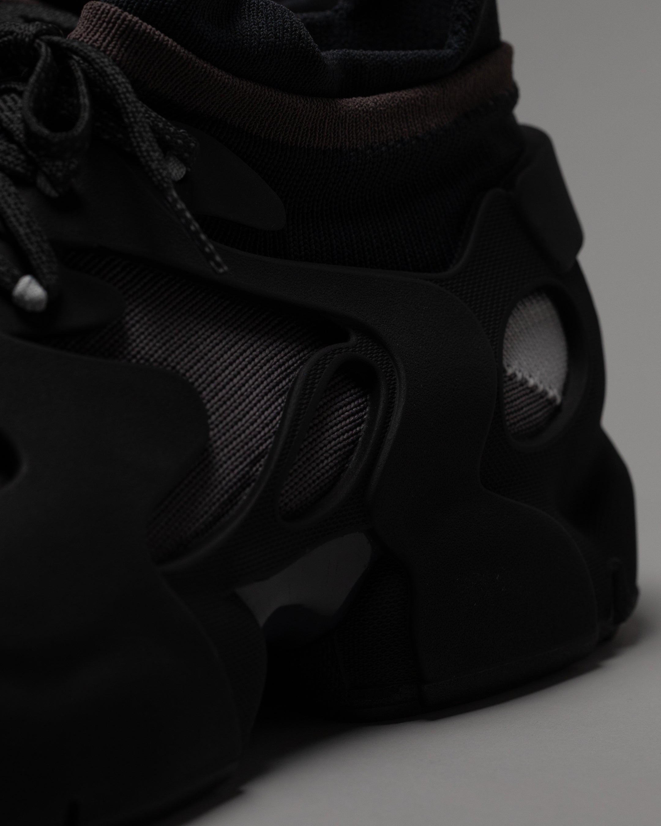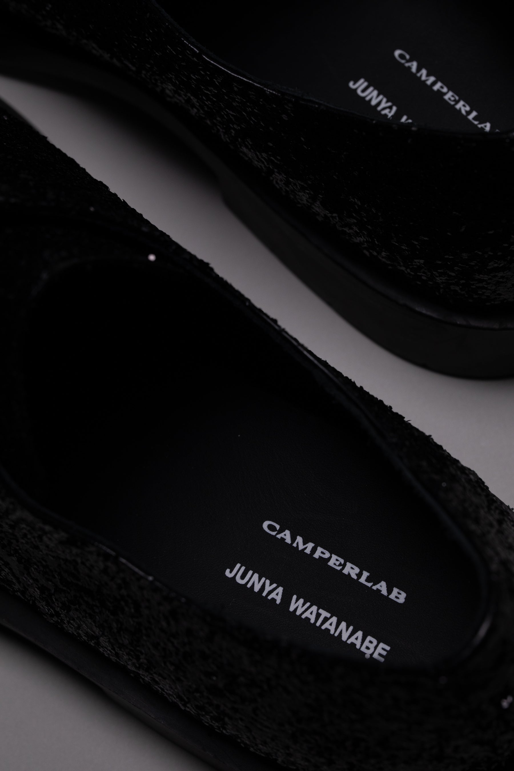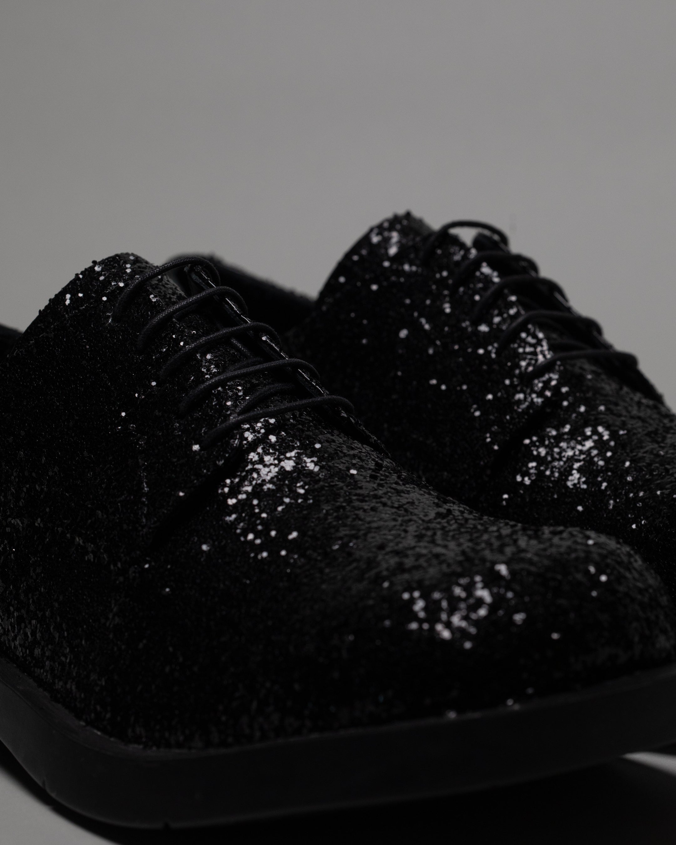 ウィメンズライン「JUNYA WATANABE」は、CAMPERLABを代表するモデルのひとつ「MIL 1978」をベースに。「MIL 1978」は、70年代からインスピレーションを得たクラシックなスタイルで、独特のフォルムとボリューム感が特徴的なモデルです。こちらは職人が1足ずつブラックグリッターを施し、特別な一足に仕上げました。アッパー、ソール、インソールまですべてブラックで統一し、スタイリッシュな佇まいに。極細のシューレースで上品さも演出しました。