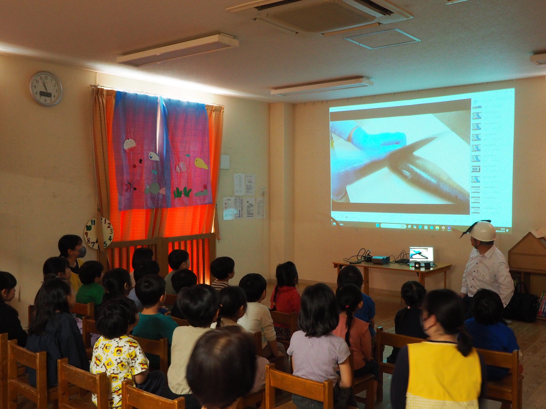 にじいろ保育園の4・5歳児31名が参加し、志田水産の担当者より子どもたちが日ごろ給食で食べている魚がどのようにして食卓に届くのかスライドを用いて説明しました。魚が穫れるところが日本から遠い寒い海であることを知った子どもたちは、驚きの声をあげていました。