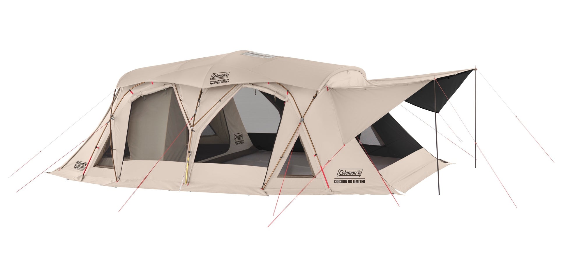 「コクーン DRリミテッド」は、マスターシリーズの1年中快適なキャンプを楽しむための豊富な機能に加えて、日光から受ける影響を大幅低減する“ダークルームテクノロジー”を搭載することで夏のキャンプでの快適性がさらに向上。また、シンプルながらもエレガントな印象を与える限定カラー“マスターグレージュ”が唯一無二の存在感を放ちます。