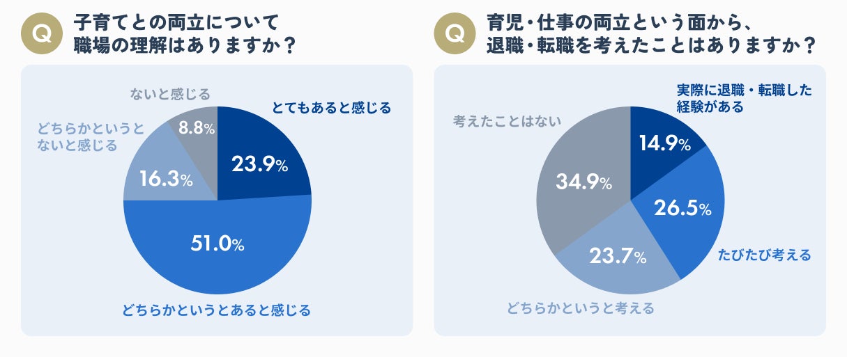 本調査では、半数以上の方が育児と仕事の両立ができていると感じているものの、6割の方が、育児・仕事の両立という観点から退職や転職に前向きであることが判明。また、育児に関して理解を示すどころか、育児を原因としてハラスメントが横行してしまうケースさえあることがわかりました。