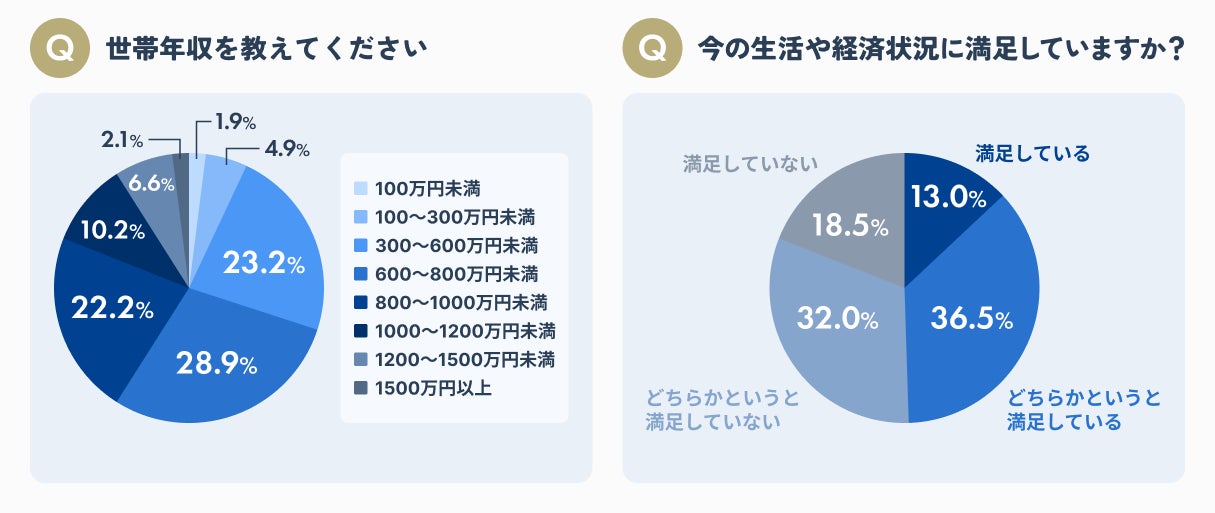 世帯年収は600万円から800万円が多く満足度はほぼ半分に分かれる
