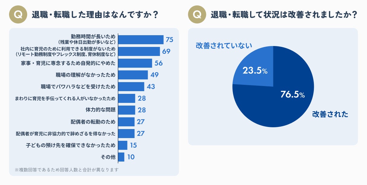 実際に育児・仕事の両立という観点で退職・転職した方のうち、「長時間勤務の解消」や「リモート勤務」の実施など状況が改善したケースは76.5%となった