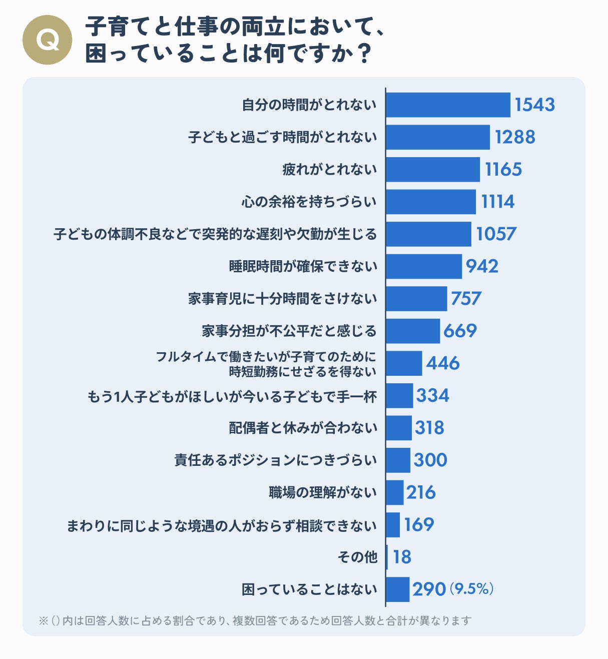 6割以上の方が育児と仕事の両立ができていると感じている一方、本調査対象の3,042人に「子育てと仕事の両立において、困っていることは何ですか?」と質問したところ、「困っていることはない」と回答した方は290人(9.5%)に留まりました。