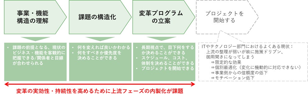 一方で、専門的なスキルと経験が必要な企業変革の上流フェーズは、外部のコンサルタントやベンダーに委ねてきた企業も多いのではないでしょうか。常態的な変化に企業として対応するためには、このような上流フェーズ(上図)を担う人財の内製化に向けたリスキリングの重要性が増していると考えます。
