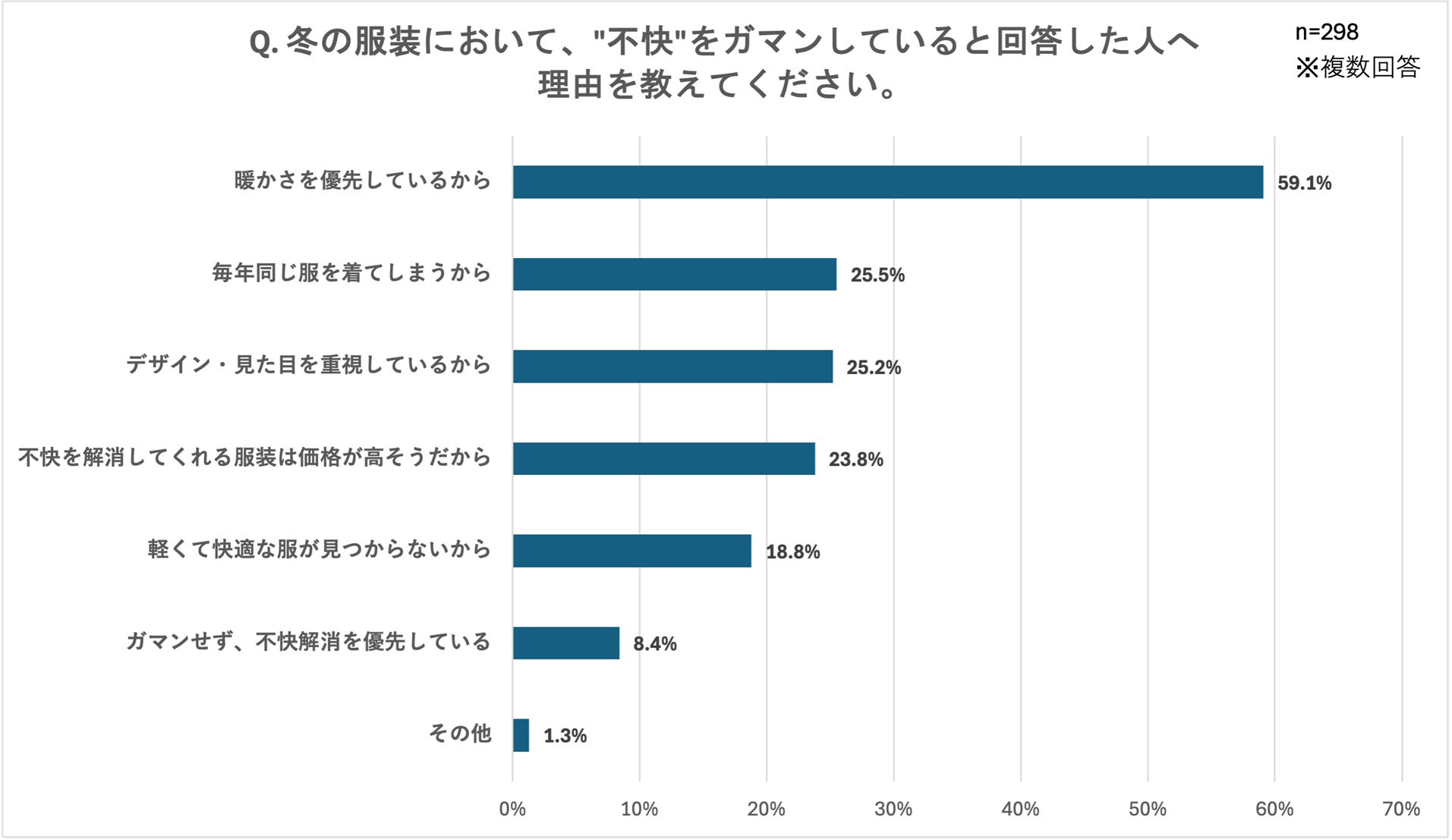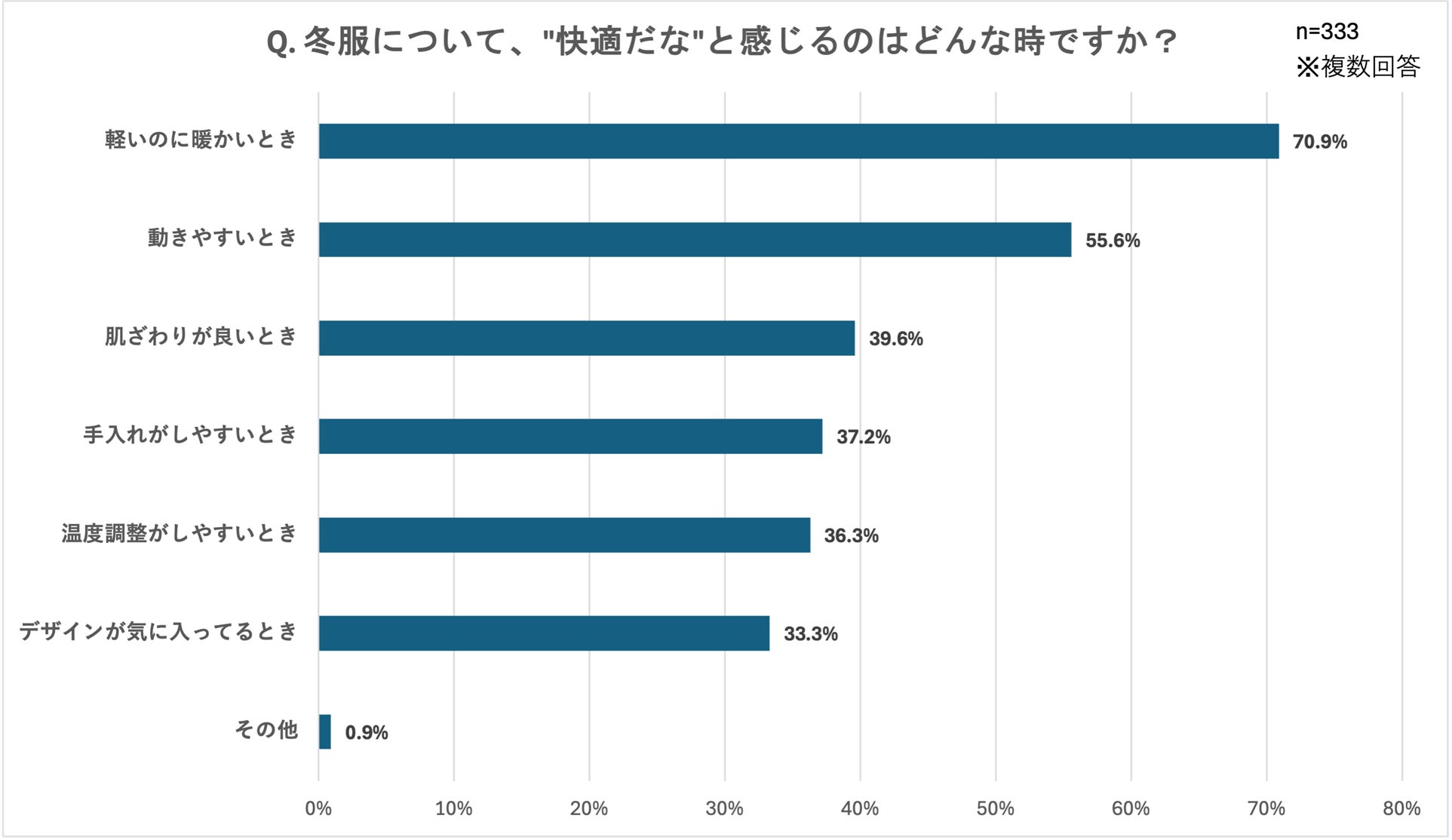 ここまで、冬の服装において不快さを感じているものの防寒も欠かせない、といった声が多いことが明らかになりましたが、さらに「”不快”をガマンしている理由を教えてください。」という設問には、「暖かさを優先しているから(59.1%)」が最多となりました。また、「冬服について、”快適だな”と感じるのはどんな時ですか?」という設問では、「軽いのに暖かい時(70.9%)」が最多となり、これらの結果から、冬服選びにおける「暖かさ」と「快適さ」という、一見ジレンマの関係にある両立を求める声が強く浮き彫りになりました。