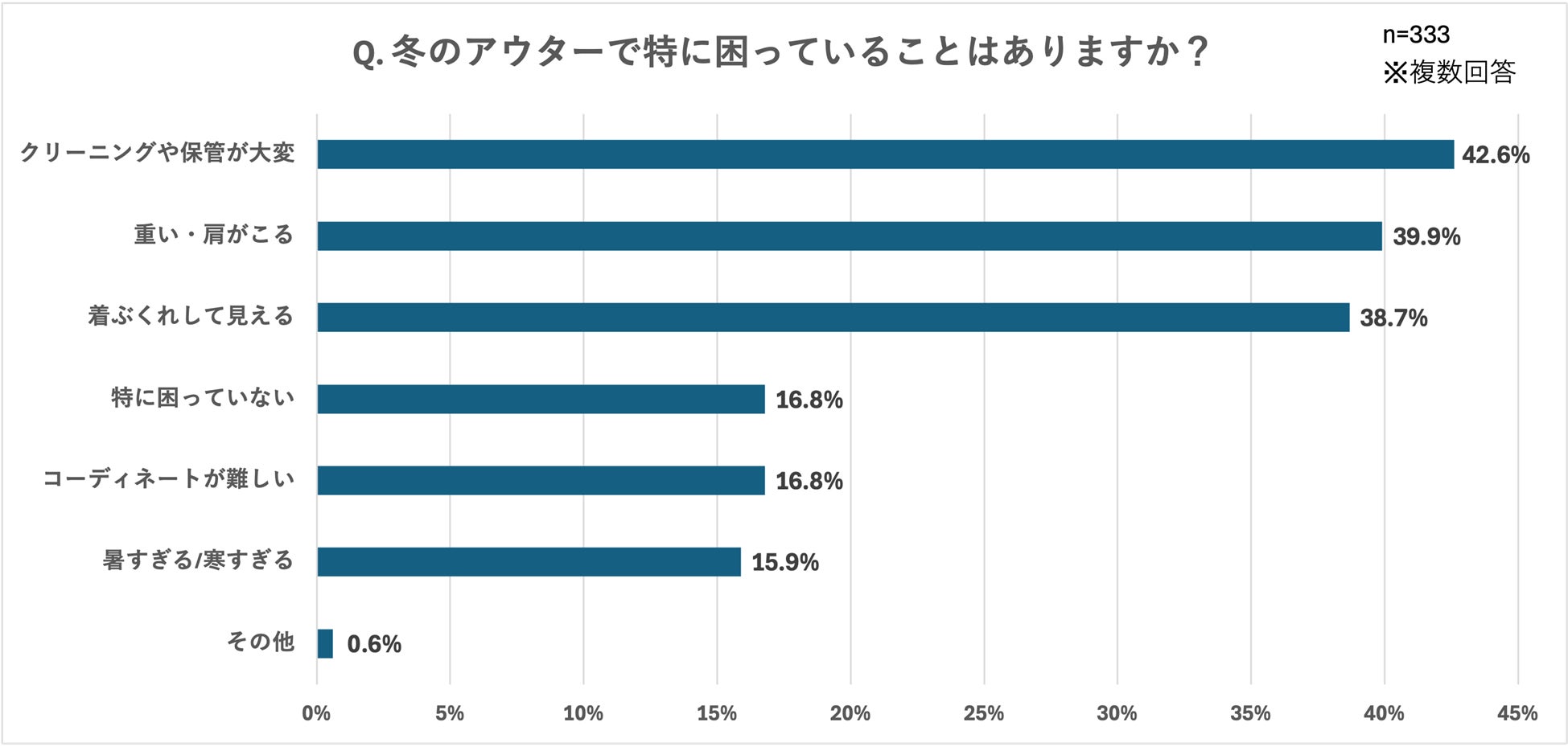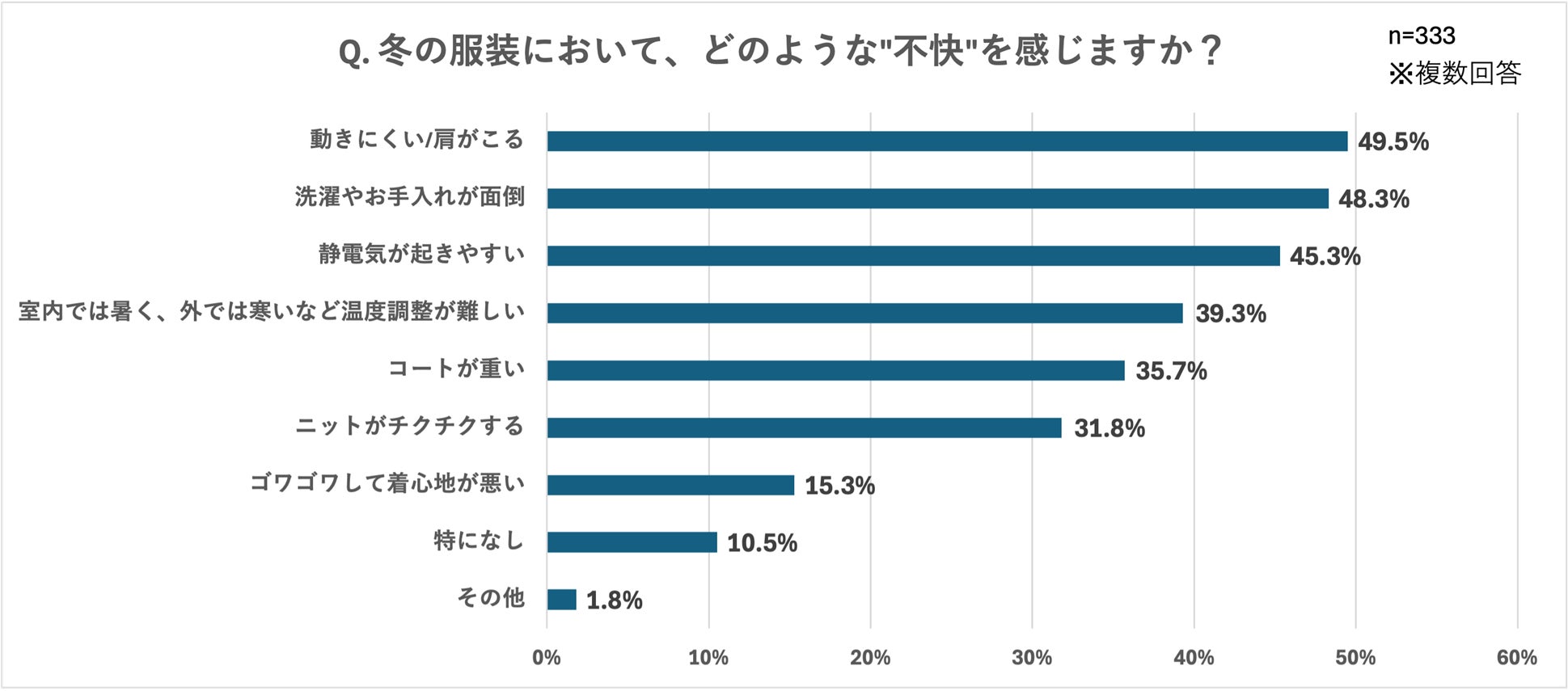 また、「冬の服装において、どのような”不快”を感じますか?」という質問には、「動きにくい/肩がこる(49.5%)」と約半数の人が回答しており、さらに「冬のアウターで特に困っていることはありますか?」という質問に対しても「重い・肩がこる(39.9%)」や「着ぶくれして見える(38.7%)」など、着心地に関する悩みが多いことがわかりました。