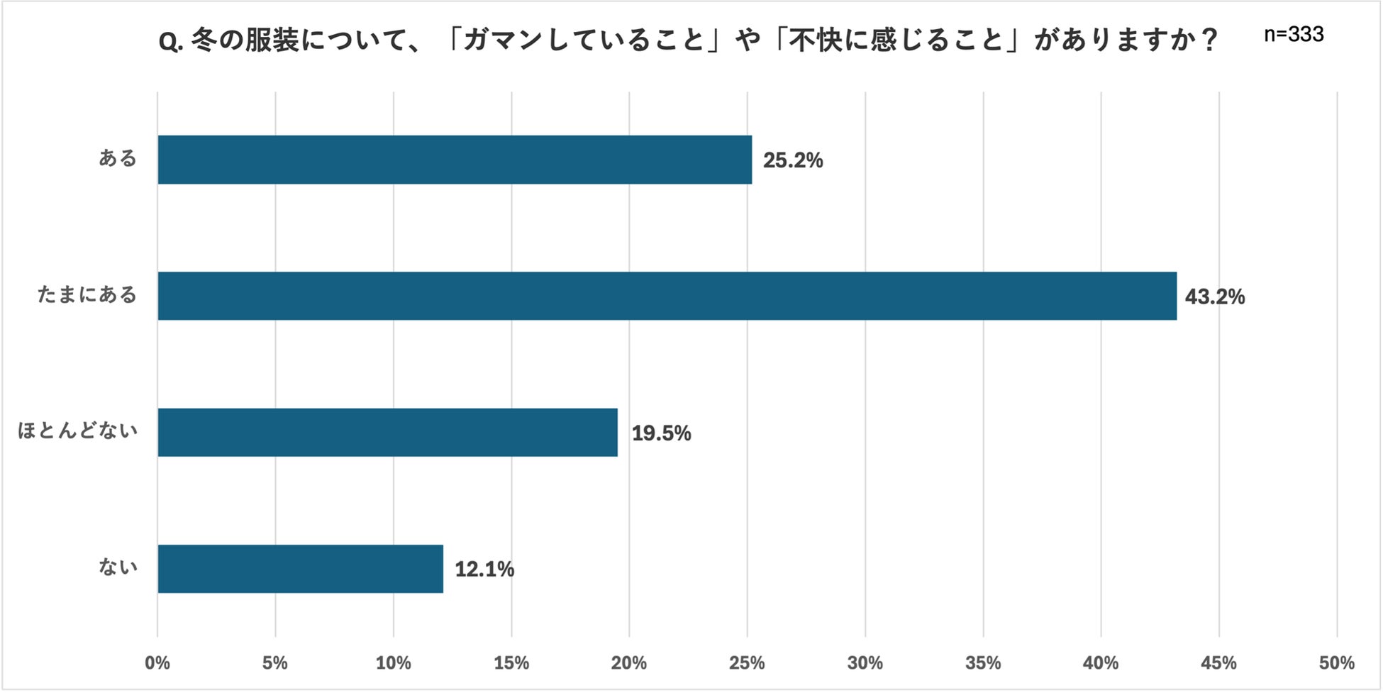 「冬の服装において、「ガマンしていること」や「不快に感じること」がありますか?」という設問に対し、「ある(25.2%)」または「たまにある(43.2%)」と答えた人が全体の68.4%となりました。
