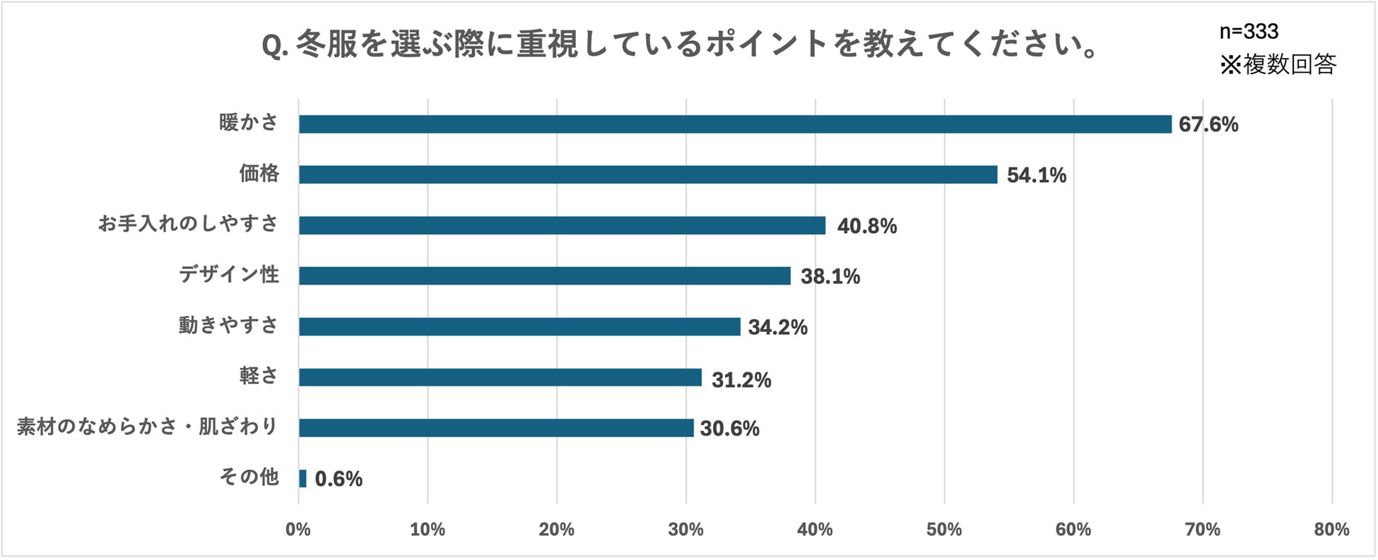 「冬服を選ぶ際に重視しているポイントを教えてください。」という設問には、「暖かさ(67.6%)」が最多となり、防寒を一番の目的とした服選びに需要があることがわかりました。