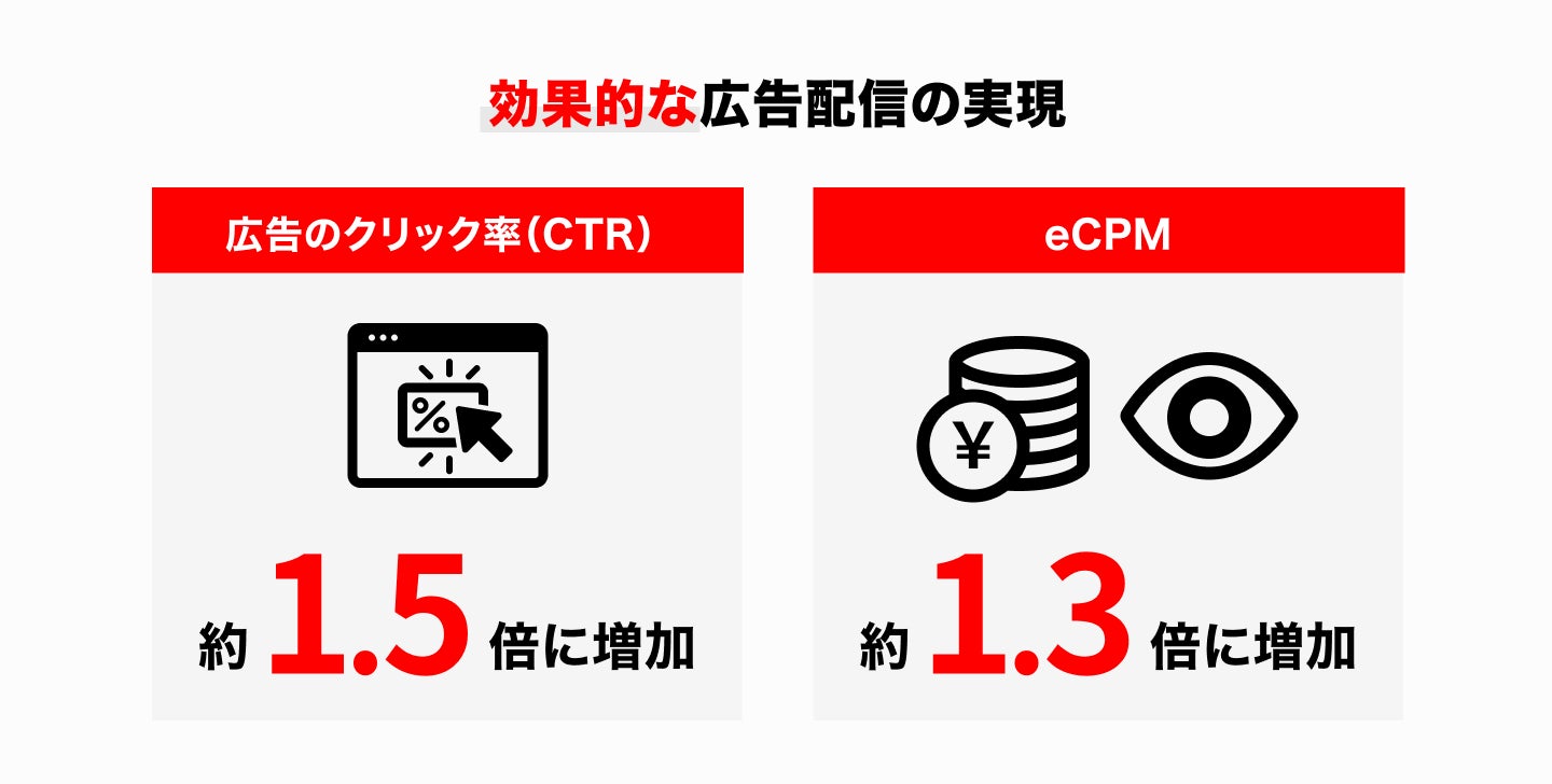 なお、本機能を活用し、ユーザーにとって興味関心の高い広告を適切なタイミング・頻度で広告配信ができるようになったことで、実際に「AppDriver」においてユーザーの広告接触機会が増加傾向にあります。一部メディア向けにリリースしたバージョンでは、広告のクリック率(CTR)が約1.5倍に向上し、eCPMも約1.3倍に増加したことを確認いたしました。