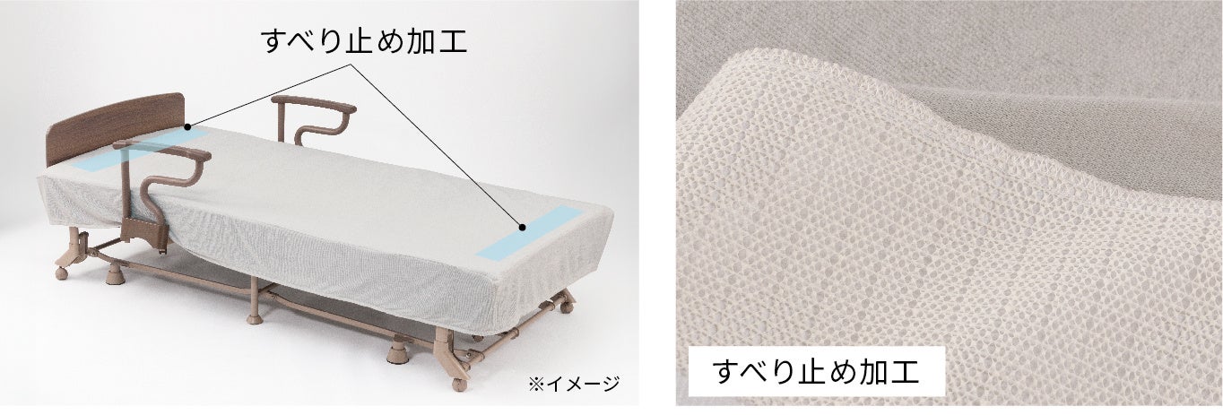 寝返りをしてもズレにくいように頭側と足側の裏側にすべり止め加工を施しました。