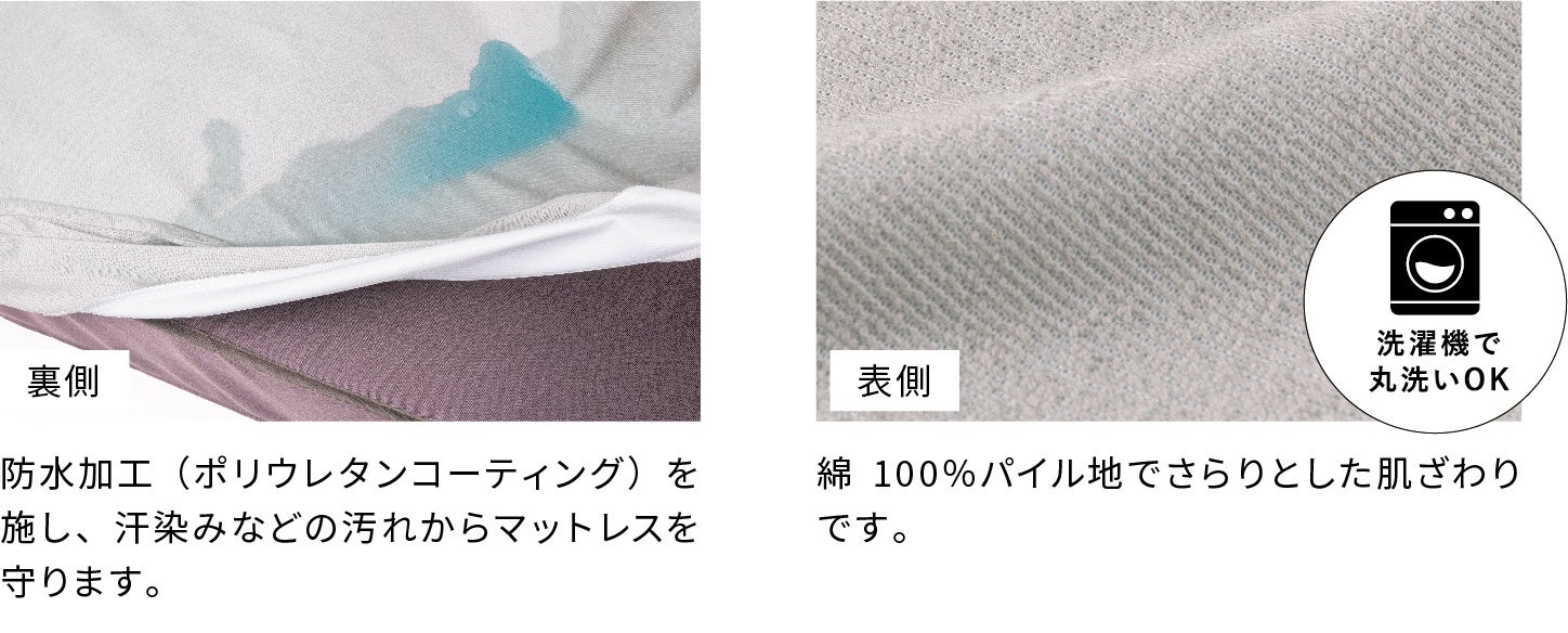裏側にポリウレタンコーティングを施し、汗染みなどの汚れからマットレスを守ります。表側には、オールシーズン使える綿100%のパイルを使用し、さらりとした肌ざわりです。また、お手入れはネットに入れてご家庭の洗濯機で洗濯できます。