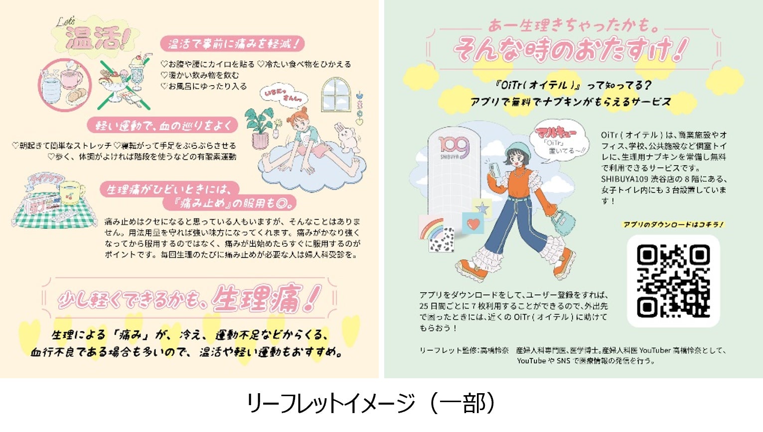 3月8日(水)、館内でお買い物をしていただいた方を対象に、産婦人科医:高橋怜奈 監修のもと制作した、「生理」についての正しい知識を記載したリーフレットと、生理用ナプキン「ナチュラムーン」のサンプルをセットにしたノベルティポーチを、SHIBUYA109渋谷店/1Fエレベーターホールにて配布いたします。リーフレット、ノベルティポーチにはイラストレーター:きさき が描き下ろしたイラストを使用いたします。