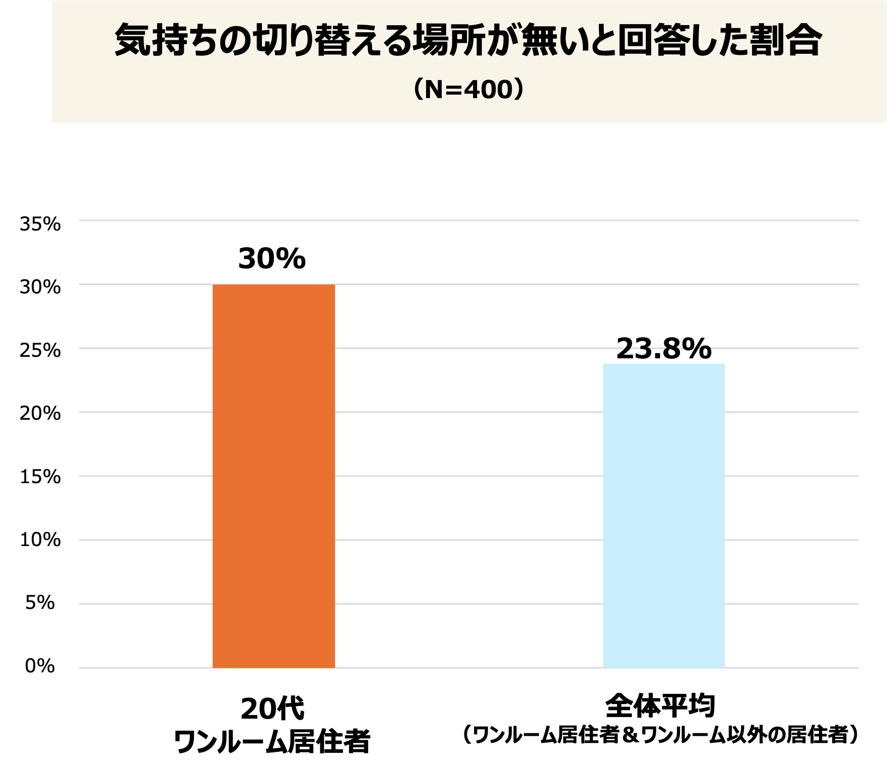 自宅の中で「一番気持ちを切り替えられる場所」を聞いたところ、20代ワンルーム居住者の30%が「切り替えられる場所はない」と回答しました。これは全体平均(23.8%)よりも高く、若年層の居住スペースに「メンタルの避難所」を持てずにいる現状が明らかになりました。