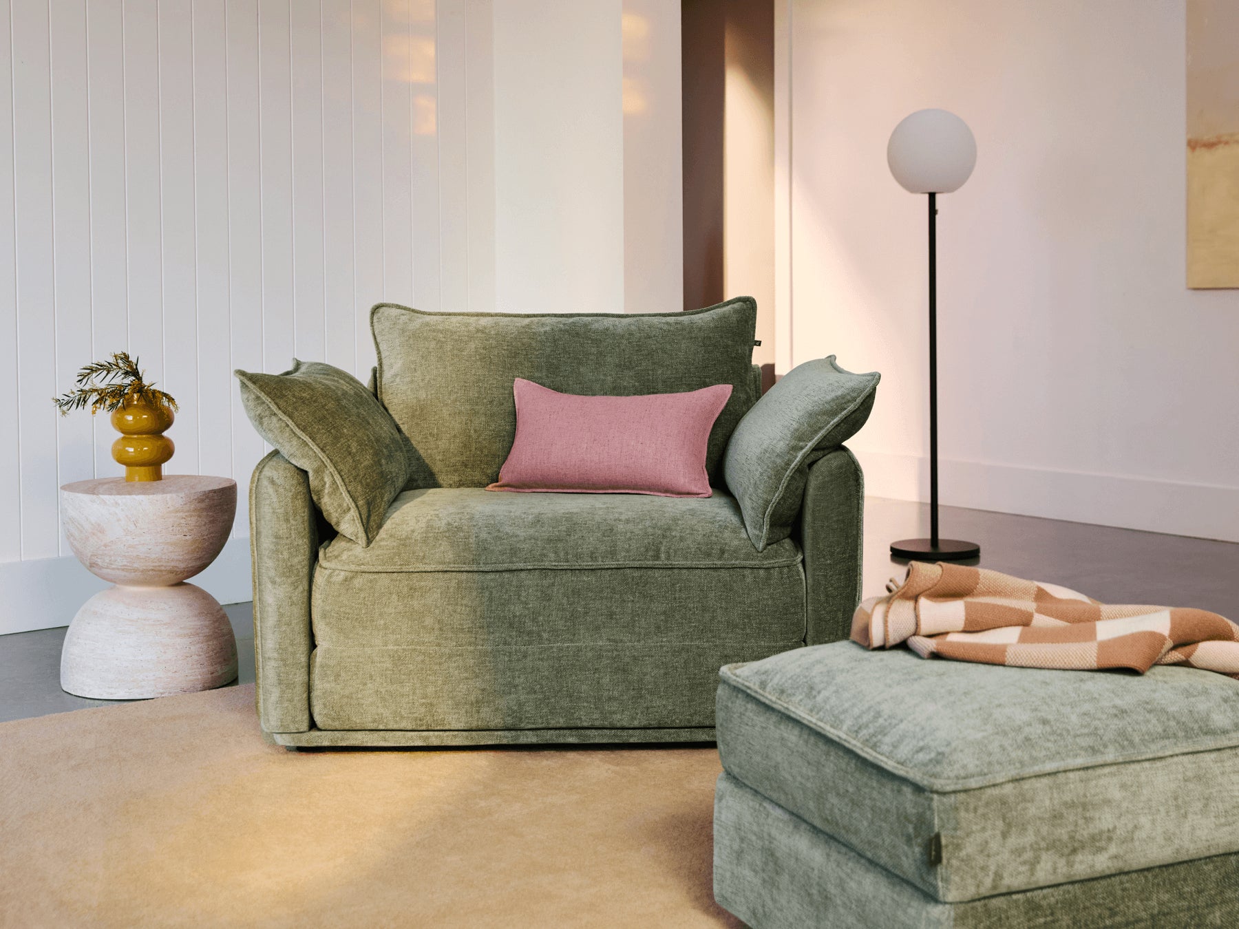 座面を手前に引き出せば、あっという間にカウチソファーへ。大人気の CUSHY使いこなしスタイルです。 映画鑑賞や読書、ストレッチなど、 ほっと一息つきたいシーンに、ゆったり足を投げ出して自分だけのとっておきのひとときを。